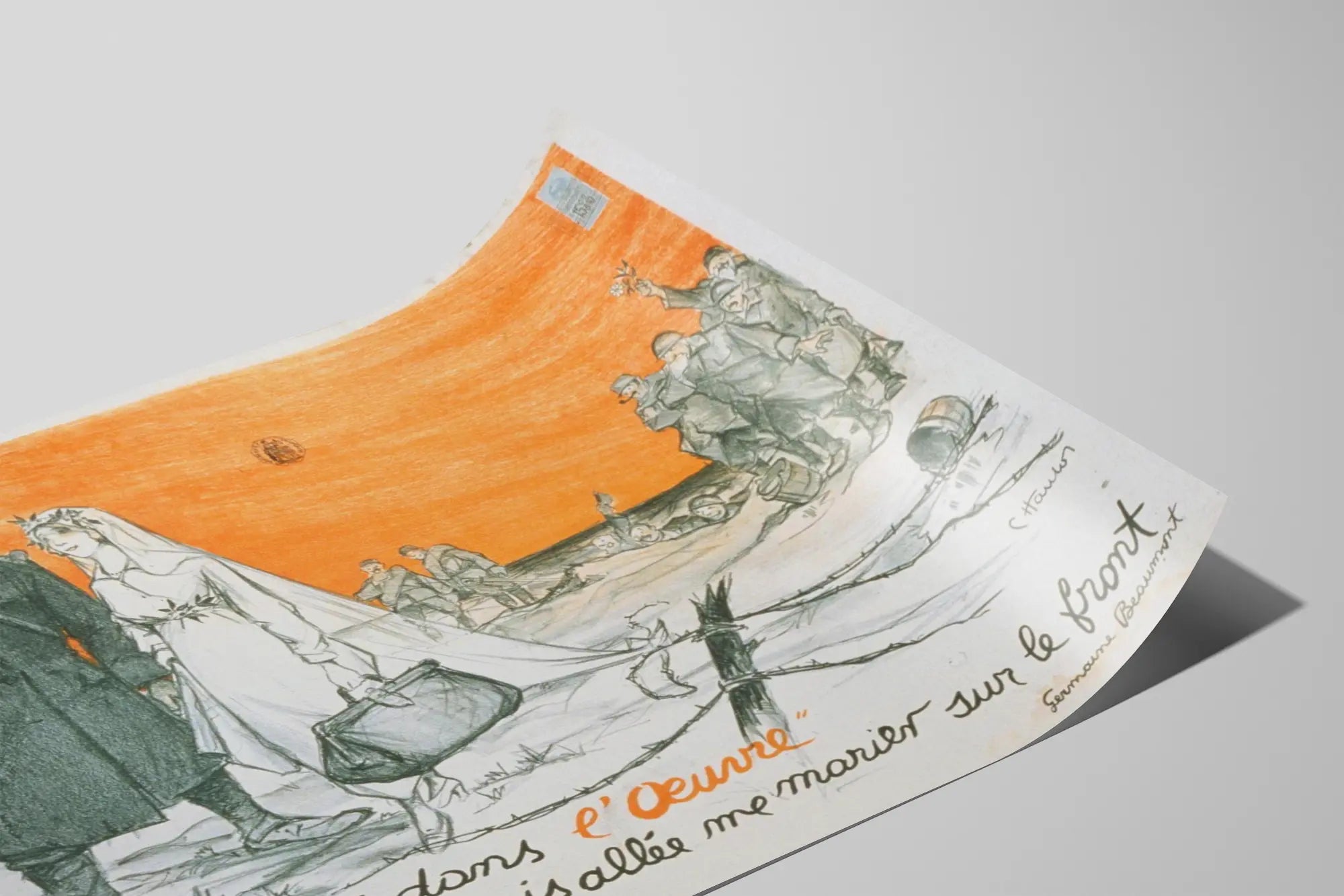 Découvrez cette affiche vintage qui illustre une scène poignante et originale de la Première Guerre mondiale : un mariage sur le front. Cette décoration murale représente un soldat en uniforme et une mariée en robe blanche, avançant côte à côte dans un paysage marqué par des fils barbelés et des soldats en arrière-plan. Le contraste entre l'orange vif du ciel et le dessin en noir et blanc accentue l'émotion et l'impact visuel de cette œuvre. Ce poster invite à la réflexion sur les histoires personnelles et les moments de vie inattendus en temps de guerre. Parfait pour les amateurs d'histoire et de décoration murale à thème vintage, ce tableau est une pièce unique pour habiller vos murs avec un message fort et une touche artistique. Son style graphique et son ambiance nostalgique en font un élément de décoration qui attire le regard et suscite la curiosité. Ajoutez cette affiche originale à votre collection de posters historiques pour accompagner votre intérieur d'un accent à la fois esthétique et chargé d'histoire.