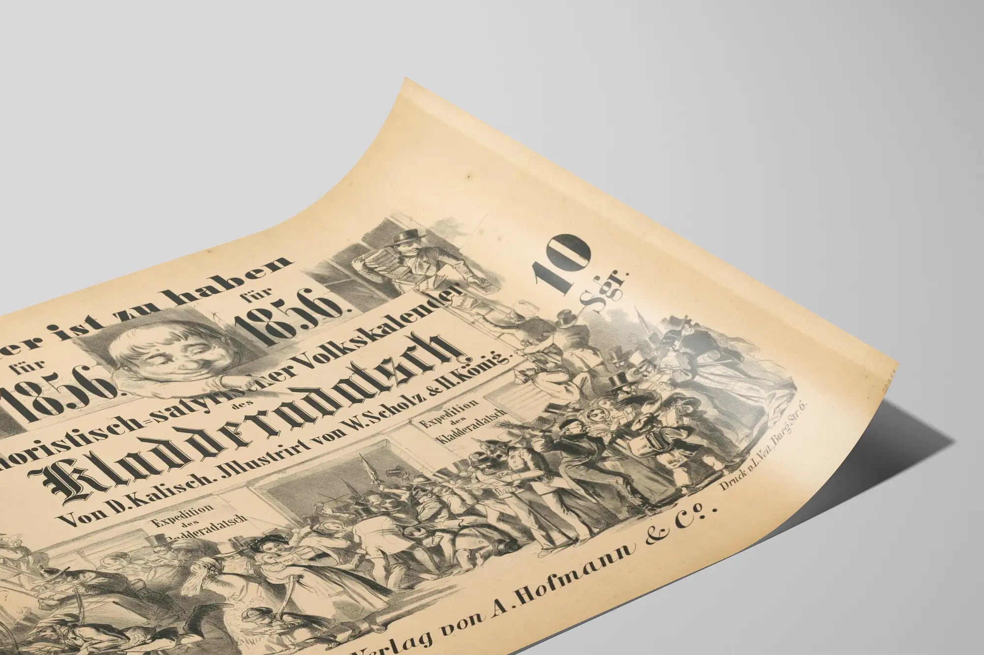 Découvrez cette affiche vintage de décoration murale, une reproduction du calendrier satirique allemand "Kladdderadatsch" datant de 1856. Cette affiche représente un dessin en noir et blanc qui illustre une scène animée où plusieurs personnages en costumes d'époque et chapeaux hauts-de-forme se pressent autour de la promotion du calendrier humoristique pour l'année 1856. Au centre de l'affiche, un personnage caricatural souriant attire le regard, encadré par de grandes inscriptions en lettres gothiques et classiques annonçant la disponibilité du "Humoristisch-satyrischer Volkskalender". Cette affiche est une pièce de décoration murale idéale pour les amateurs d'art graphique historique, de gravures anciennes et d'esthétique rétro. Elle capte l'essence de l'illustration satirique du XIXe siècle et pourra embellir un intérieur dans un style vintage ou éclectique. Ce poster mural peut également être utilisé comme élément décoratif significatif dans un espace de travail, un salon ou une bibliothèque, apportant une touche d'humour et d'histoire. En tant que décoration murale, cette affiche offre un particulier charme et authenticité, grâce à ses détails soignés et son ambiance typique de l'Allemagne du milieu du XIXe siècle. Apportez une note culturelle et originale à votre espace avec cette affiche au style graphique marqué, idéale pour décorer vos murs avec caractère et personnalité.