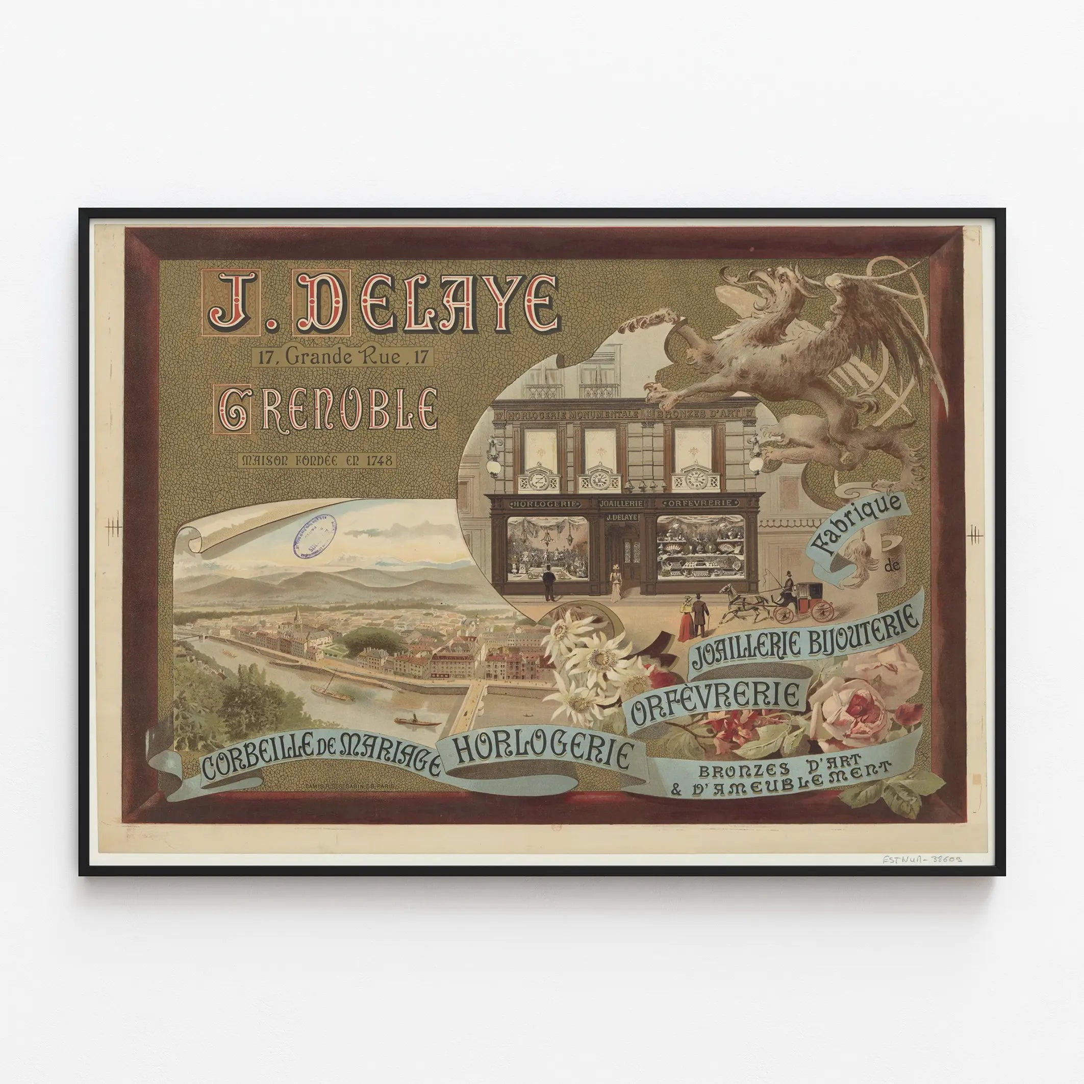 Découvrez cette affiche vintage de la maison J. Delaye, située au 17 Grande Rue à Grenoble, spécialisée dans la joaillerie, bijouterie, orfèvrerie et horlogerie. Ce poster publicitaire artistique met en avant une fabrique réputée, fondée en 1748, avec une représentation détaillée de la façade de la boutique, élégamment décorée et montrant des vitrines riches en objets d'horlogerie et de bijoux. Le visuel intègre un dragon mythique stylisé, un panorama pittoresque de Grenoble avec ses rivières et ses collines, ainsi qu'une composition florale délicate avec des fleurs comme l'edelweiss et des roses, apportant une touche romantique et naturelle à cette décoration murale. Enroulés sur des banderoles peintes, les différents métiers de la maison sont mis en lumière : corbeille de mariage, horlogerie, joaillerie, bijouterie, orfèvrerie et bronzes d'art et d'ameublement. Cet affichage publicitaire original est un excellent choix pour les amateurs d'histoire, de décoration rétro ou pour ceux qui souhaitent apporter un style authentique et vintage à leur intérieur. Que ce soit comme affiche décorative dans un salon, un bureau ou un espace commercial, ce visuel invite à un voyage dans le temps, illustrant l'élégance et le savoir-faire artisanal du XVIIIe siècle à Grenoble. Apportez une touche de charme ancien avec cette invitation murale mêlant art, tradition et métier d'exception.