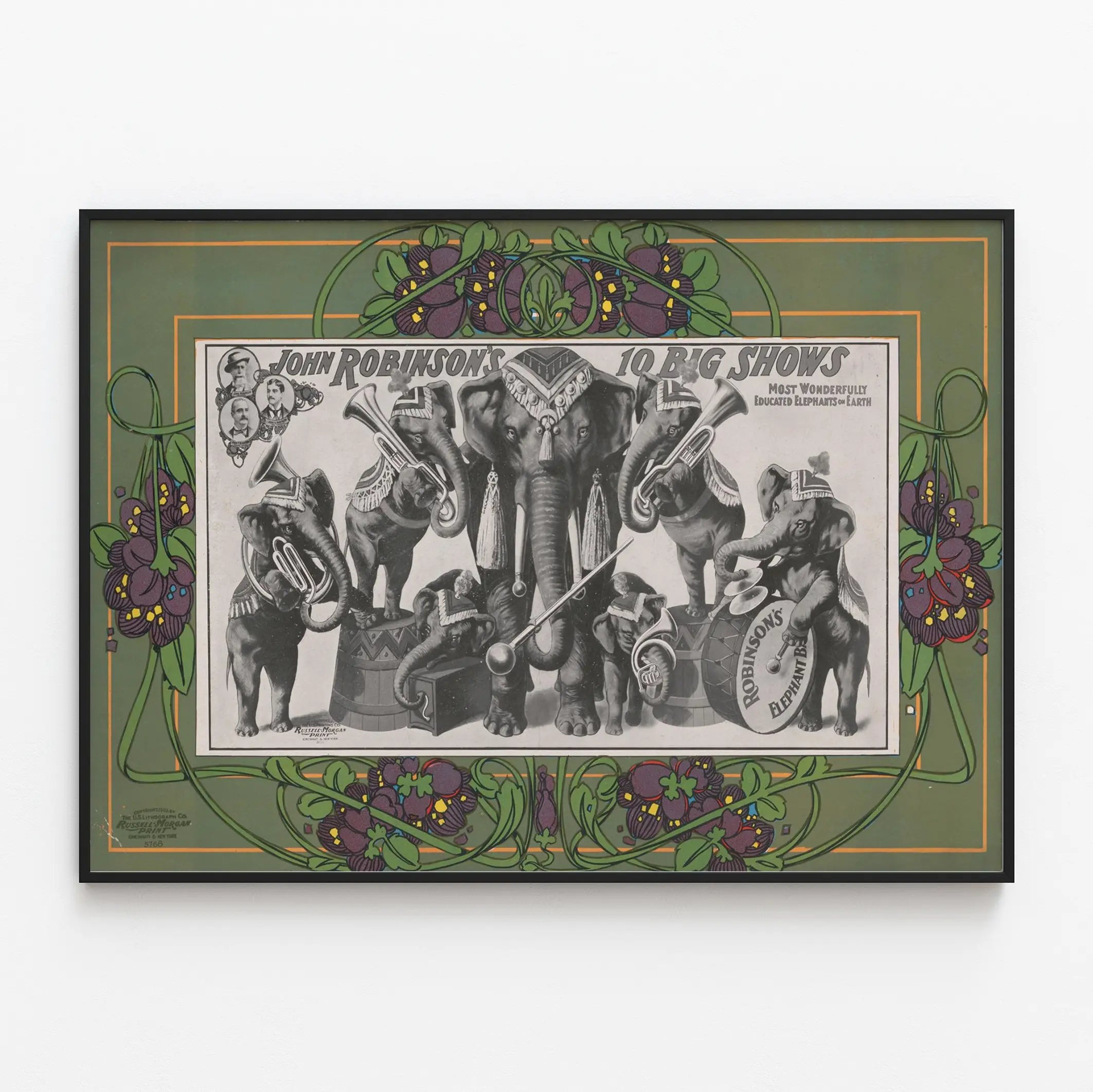 Cette affiche vintage illustre avec charme "John Robinson's 10 Big Shows" mettant en scène un groupe d'éléphants habillés et jouant d’instruments de musique, évoquant un spectacle unique d'éléphants éduqués. Cette décoration murale au style rétro et artistique imprime une ambiance nostalgique et ludique, parfaite pour une décoration intérieure originale. Le poster présente un cadre orné de motifs floraux aux couleurs discrètes et harmonieuses, soulignant le dessin central en noir et blanc où figurent plusieurs éléphants musiciens, illustrant un instant animé et fascinant. L'attention portée aux détails des instruments et des costumes, ainsi que la mise en page équilibrée, font de cette affiche un objet décoratif captivant qui attirera l'œil dans un salon, une chambre ou une salle de spectacle. Ce tableau mural est idéal pour les amateurs d'art vintage, de cirque ou de décoration thématique animalière, apportant une touche d'authenticité et de caractère à tout espace. Son style graphique unique combine illustration et typographie d'époque pour un rendu visuel impactant. Utiliser cette affiche comme objet décoratif mural permet d'ajouter une note artistique et historique à votre intérieur, tout en célébrant le folklore des spectacles animaliers d'autrefois. Le cadre végétal qui entoure la composition fait écho à la nature et à la tradition, renforçant le charme et la richesse visuelle de cette pièce décorative. Cette affiche est un choix parfait pour enrichir un mur avec une touche de poésie, de fantaisie et de mémoire culturelle, indispensable dans une collection d'affiches décoratives ou posters artistiques.