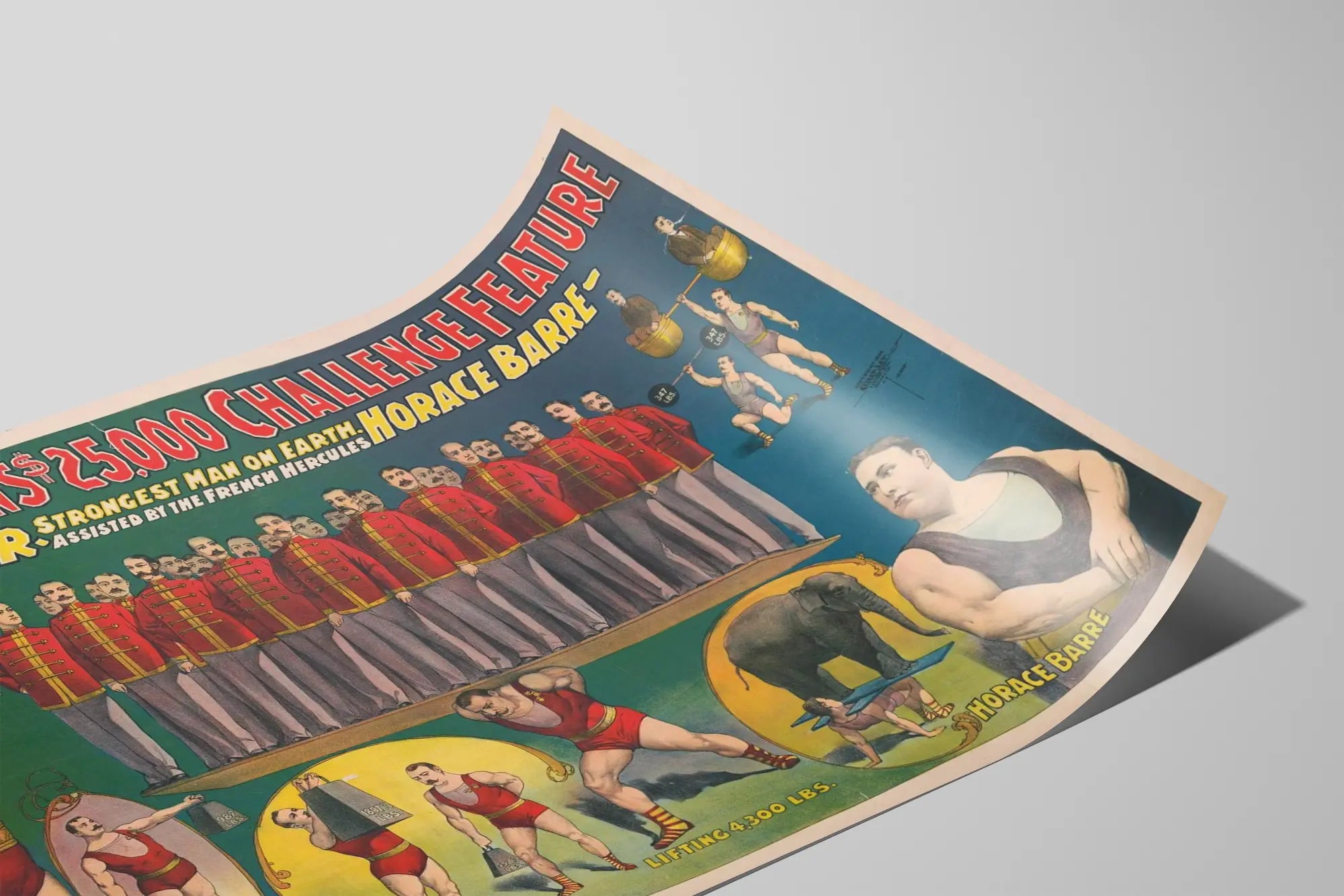 Cette affiche vintage exceptionnelle met en scène John Robinson's $25,000 Challenge Feature, mettant en lumière deux figures emblématiques de la force physique : Mr Louis Cyr, réputé comme l'homme le plus fort de la Terre, assisté par Horace Barre, surnommé le Hercule français. Cette décoration murale, au style ancien et coloré, est une véritable illustration d'un défi de force impressionnant. On y voit Louis Cyr en tenue de lutte, dans diverses poses montrant sa puissance exceptionnelle, notamment soulevant près de 4 300 livres. Plusieurs illustrations montrent ses exploits, comme porter un poids important, soulever des charges lourdes et même soutenir un éléphant, symbolisant sa force hors du commun. Horace Barre est également représenté, ajoutant une dimension collaborative à ce défi exceptionnel. Au centre, une rangée d'hommes en uniformes rouges soutient une plateforme qu'ils lèvent collectivement, sans effort apparent, une démonstration visuelle puissante de force collective et individuelle. Ce poster ancien avec ses couleurs vibrantes rouge, jaune, vert et bleu, conjugue art et histoire dans le domaine de la décoration murale. Il est idéal pour les passionnés d'histoire du cirque, de performances physiques extraordinaires et de design rétro. L'affiche, par son esthétique et sa composition narrative, séduira ceux qui recherchent une pièce unique pour agrémenter un intérieur avec une touche authentique et une ambiance vintage forte, mêlant spectacle et force physique impressionnante. Que ce soit en encadrement classique ou en poster directement posé sur un mur, il s'adapte parfaitement aux espaces dédiés à la décoration murale originale, affiches historiques et tableaux illustratifs. Une création qui célèbre les exploits des plus grands athlètes de force au tournant du XXe siècle.