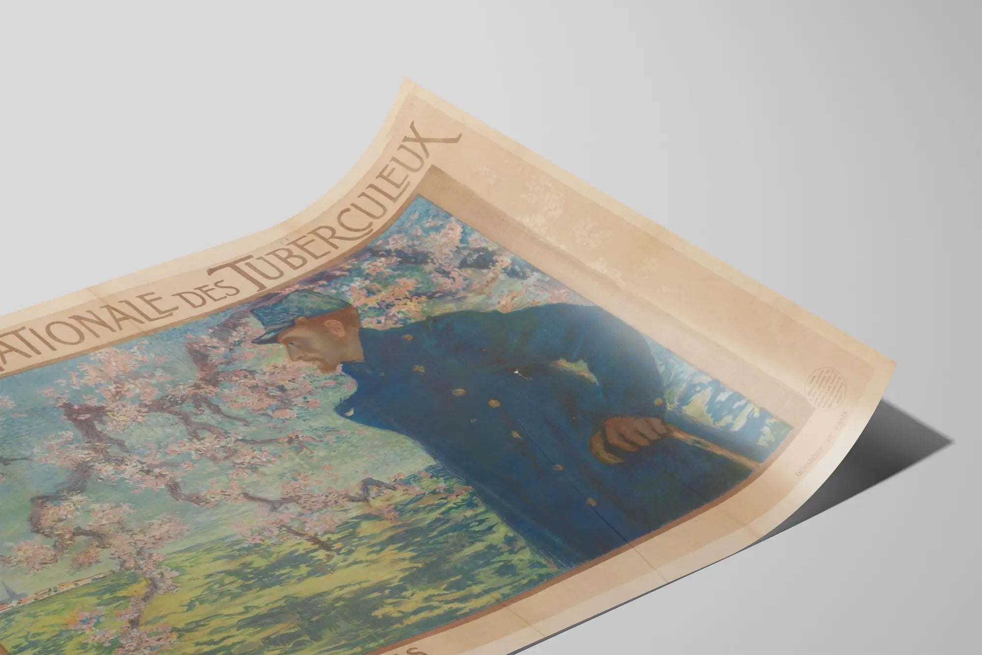 Découvrez cette affiche ancienne et rare intitulée "Journée Nationale des Tuberculeux Anciens Militaires", une pièce unique de décoration murale qui apporte une touche d'histoire et de mémoire à votre intérieur. Cette affiche met en scène un ancien militaire, représenté en plein air sous un arbre en fleurs, symbole de renouveau et d'espoir. Le personnage est vêtu d'un manteau militaire bleu foncé et tient une canne, soulignant son statut et ses combats passés. L'arrière-plan est dominé par un paysage champêtre lumineux, avec des touches de vert et de rose, ce qui apporte une atmosphère apaisante et nostalgique à cette œuvre graphique. Cette affiche vintage, imprimée à Paris par Devambez, évoque la reconnaissance envers les anciens combattants tuberculeux, une thématique historique forte. Le texte soigneusement calligraphié encadre l'image, soulignant l'intitulé de l'événement. Parfaite pour les amateurs d'art graphique historique, cette décoration murale peut s'intégrer aussi bien dans un salon, un bureau ou une bibliothèque, ajoutant une note de profondeur et de réflexion historique à votre décoration. L'affiche utilise des couleurs douces et un style pointilliste ou impressionniste qui met en valeur les effets de lumière sur les feuilles et les vêtements. Ce poster muraux se démarque par son équilibre entre le texte et l'image, créant un tableau décoratif à la fois esthétique et significatif. Que vous soyez passionné par la mémoire militaire, l'histoire de la santé publique ou simplement à la recherche d'une décoration murale originale et porteuse de sens, cette affiche sera un choix remarquable. Son format permet une mise en valeur sur un mur seul ou accompagné d'autres affiches vintage dans un style harmonieux. Apportez une dimension artistique et historique à votre intérieur avec ce poster "Journée Nationale des Tuberculeux Anciens Militaires", un véritable témoignage graphique à conserver et à exposer.