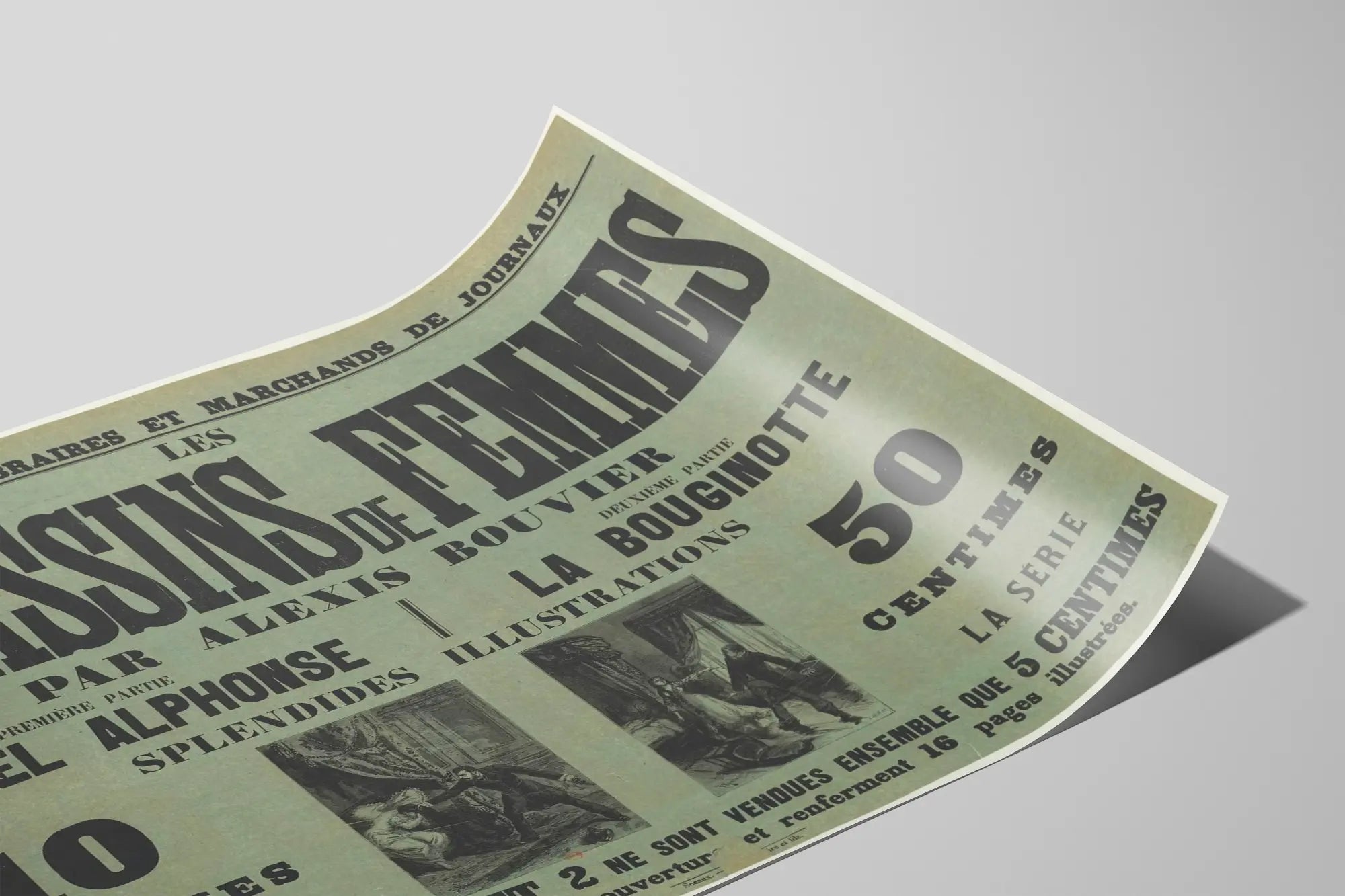 Cette affiche vintage intitulée "Les Assassins de Femmes" par Alexis Bouvier est une pièce intrigante qui séduira les amateurs de décoration murale au style rétro et historique. Présentée sous forme de poster imprimé, cette décoration murale attire le regard par sa typographie imposante et son design typique des publications anciennes. Idéale pour habiller un mur avec caractère, cette affiche représente une époque révolue de la littérature populaire et illustre un univers sombre et mystérieux.