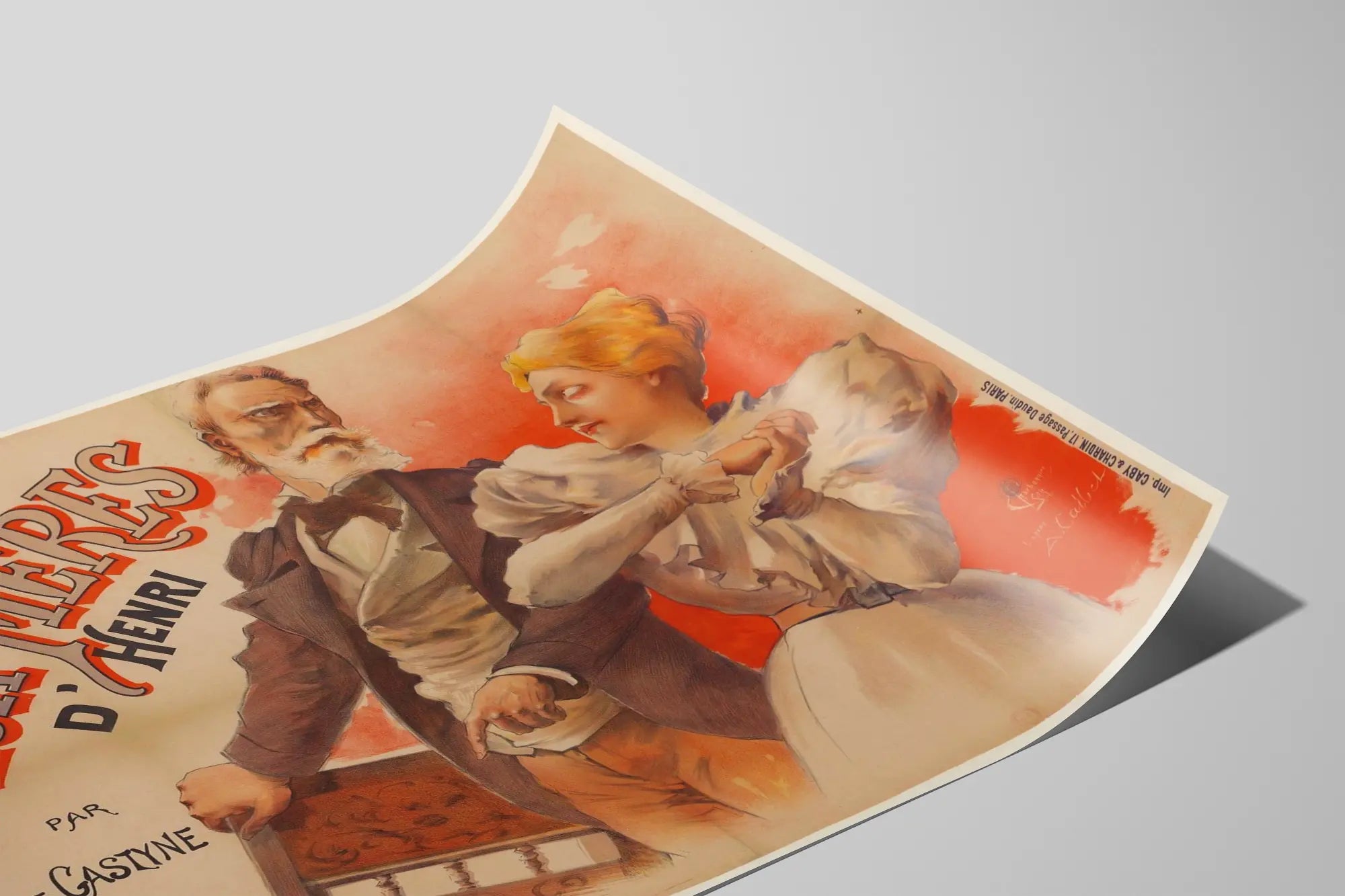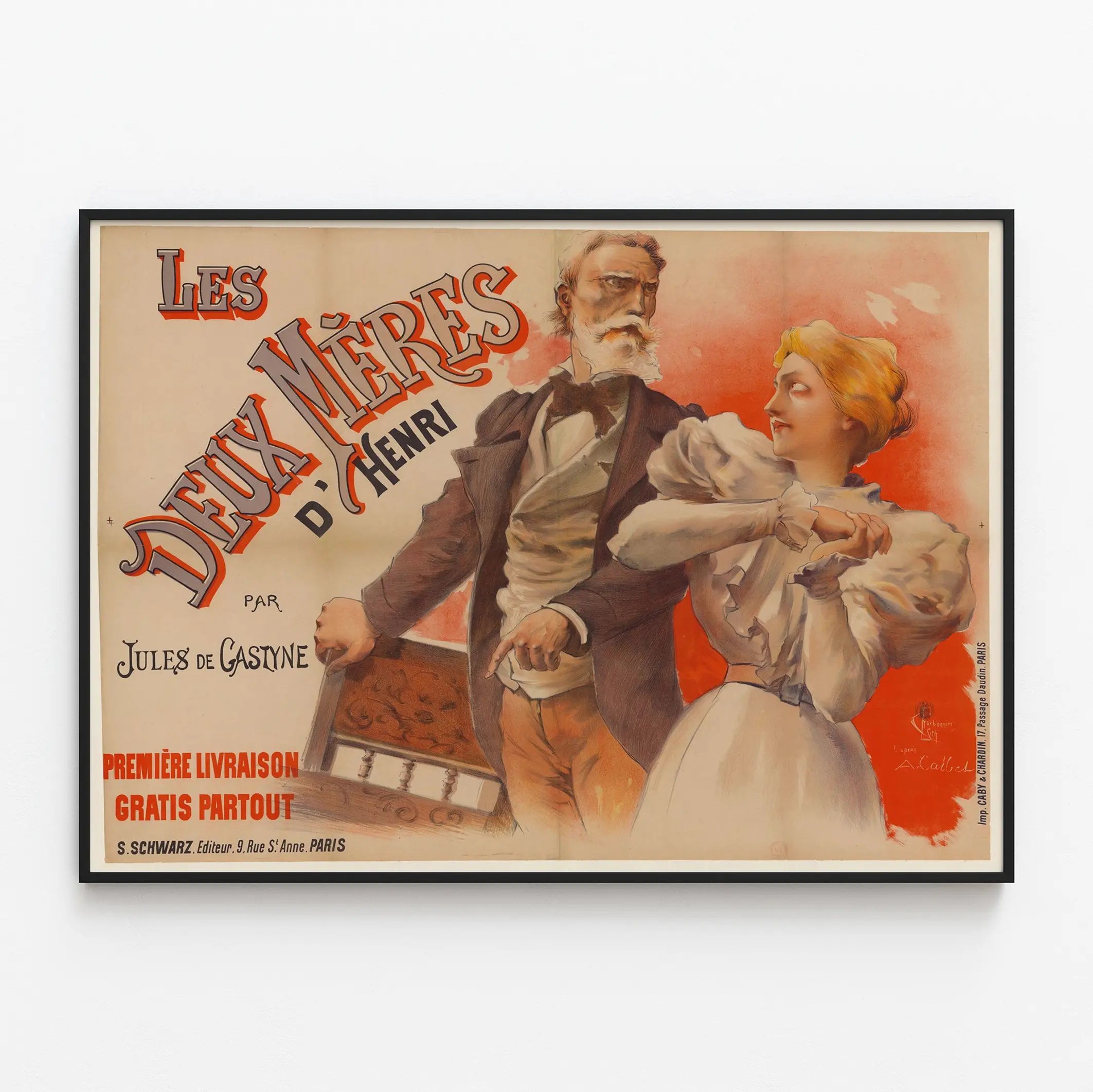 Découvrez cette affiche vintage originale intitulée « Les Deux Mères d'Henri », réalisée par Jules de Gastyne. Avec un style graphique distinctif et une composition expressive, cette décoration murale apporte une touche d'art et d'histoire à votre intérieur. Cette affiche, imprimée en lithographie, met en scène deux personnages féminins et un homme âgé dans une posture pleine de tension et de caractère, évoquant une narration dramatique. Les teintes chaudes dominantes, notamment un arrière-plan rouge orangé, renforcent l'intensité de la scène. Cette œuvre illustre un style artistique typique du début du XXe siècle, combinant finesse du dessin et mise en couleur maîtrisée, idéale pour une décoration murale au style rétro et élégant. Que ce soit pour une chambre, un salon ou un bureau, ce poster ajoute une ambiance théâtrale et historique unique à votre espace. L'affiche porte également les inscriptions d'édition et d'impression, ce qui témoigne de son authenticité et de son procédé d'origine. Offrez-vous cette pièce de décoration murale pour enrichir votre collection d'affiches anciennes ou pour habiller vos murs avec un objet artistique chargé de caractère.