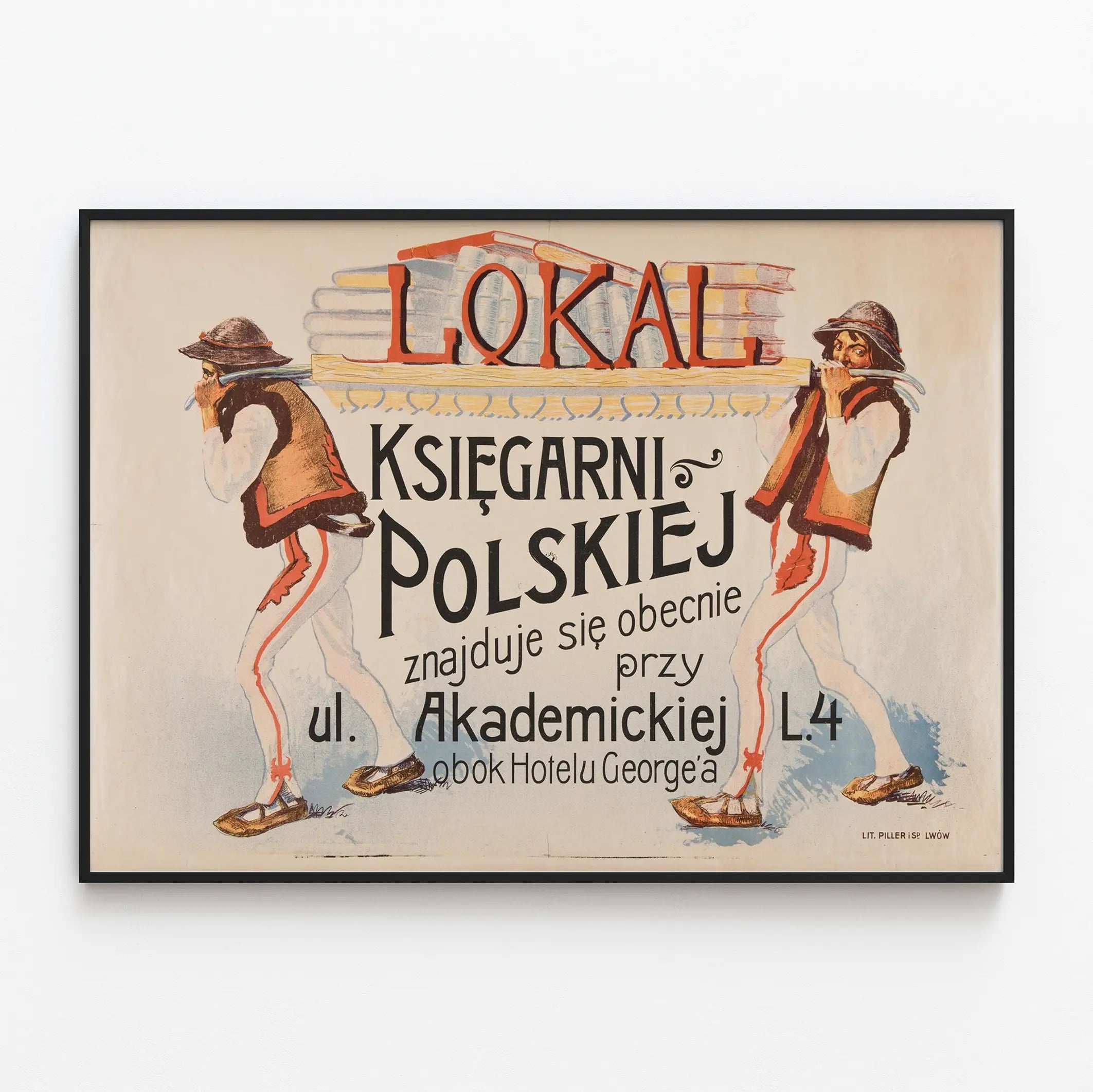 Apportez une touche d'authenticité et d'histoire à votre décoration murale avec cette affiche vintage intitulée "Lokal Księgarni Polskiej". Cette affiche publicitaire, imprimée par Lit. Piller à Lwów, met en scène de manière artistique deux hommes en costume traditionnel polonais portant une étagère chargée de livres, évoquant l'univers chaleureux et culturel d'une librairie polonaise. Le texte en polonais indique l'emplacement de la librairie, située dans la rue Akademickiej, à côté de l'hôtel George, ce qui ajoute un aspect authentique et historique à cette pièce de décoration murale. Ce poster est parfait pour les amateurs de vintage, les passionnés de culture polonaise, ou encore ceux qui recherchent une affiche au charme rétro pour sublimer un intérieur de style classique ou éclectique. Avec ses couleurs douces et ses illustrations soignées, cette affiche s'intègre harmonieusement dans différents types d'espaces : bibliothèques, salons, bureaux ou coins lecture. Elle peut également compléter une collection d'affiches anciennes ou d'œuvres graphiques liées au monde du livre et de la connaissance. Ce poster original, qui joue à la fois sur un message typographique et un dessin traditionnel, est un exemple remarquable de la communication visuelle des librairies d'autrefois. Suspendue au mur, cette affiche vintage raconte une histoire et invite à la découverte littéraire, tout en apportant une ambiance chaleureuse et culturelle à votre espace. En choisissant cette décoration murale, vous optez pour une pièce unique, rendue attrayante par son caractère historique et son esthétique singulière. Faites de cette affiche un élément central de votre décoration intérieure, valorisant non seulement votre passion pour les livres mais aussi votre goût pour le graphisme d'époque et l'art publicitaire ancien.