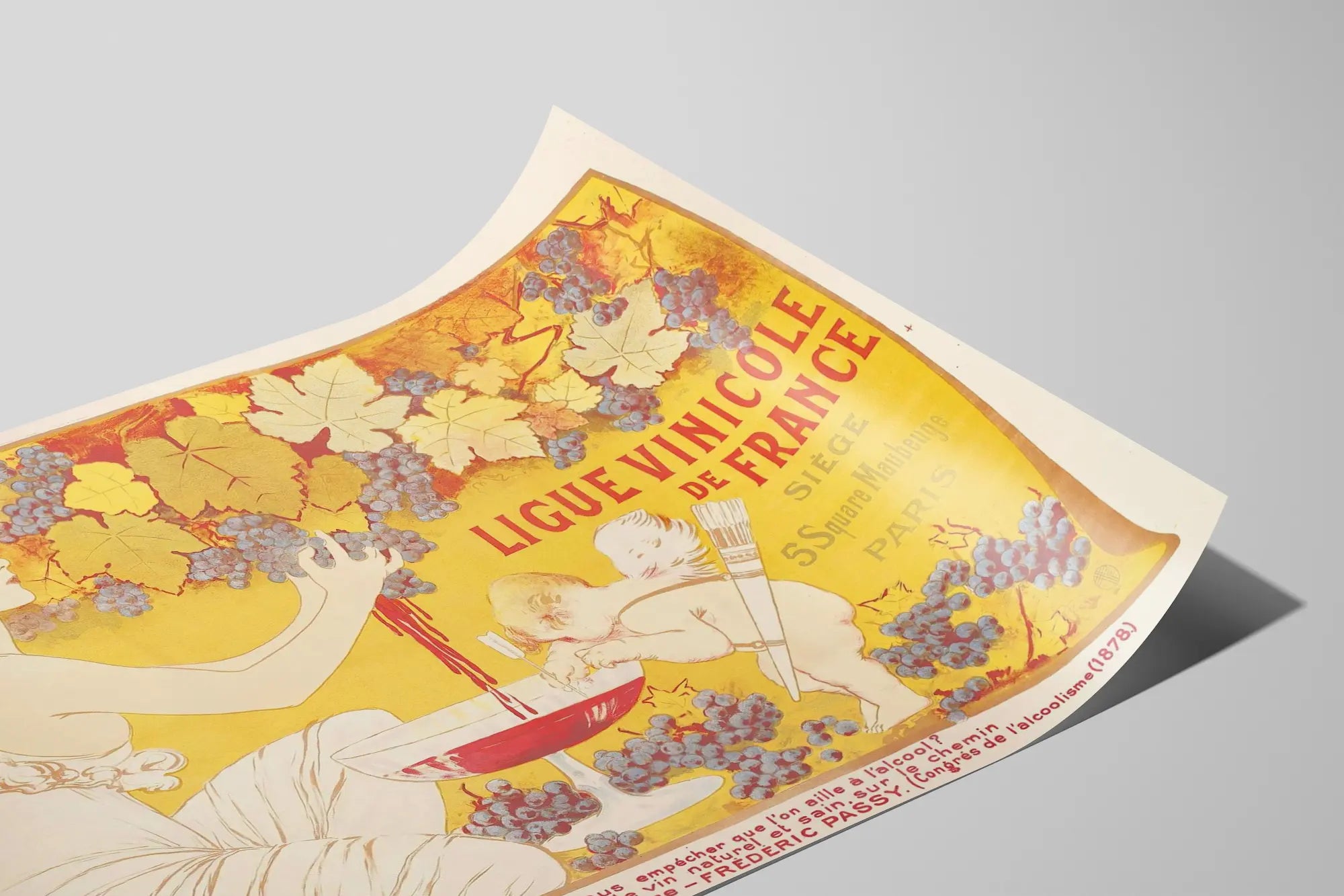 Le texte "Ligue Vinicole de France" est inscrit en lettres rouges audacieuses sur la droite, accompagné de l'adresse "5 Square Maubeuge, Paris", ce qui confère un aspect historique et authentique à cette affiche. Un slogan en bas rappelle l'importance du vin naturel, en lien avec un congrès de l'alcoolisme en 1878, soulignant un message social lié à la consommation raisonnée.