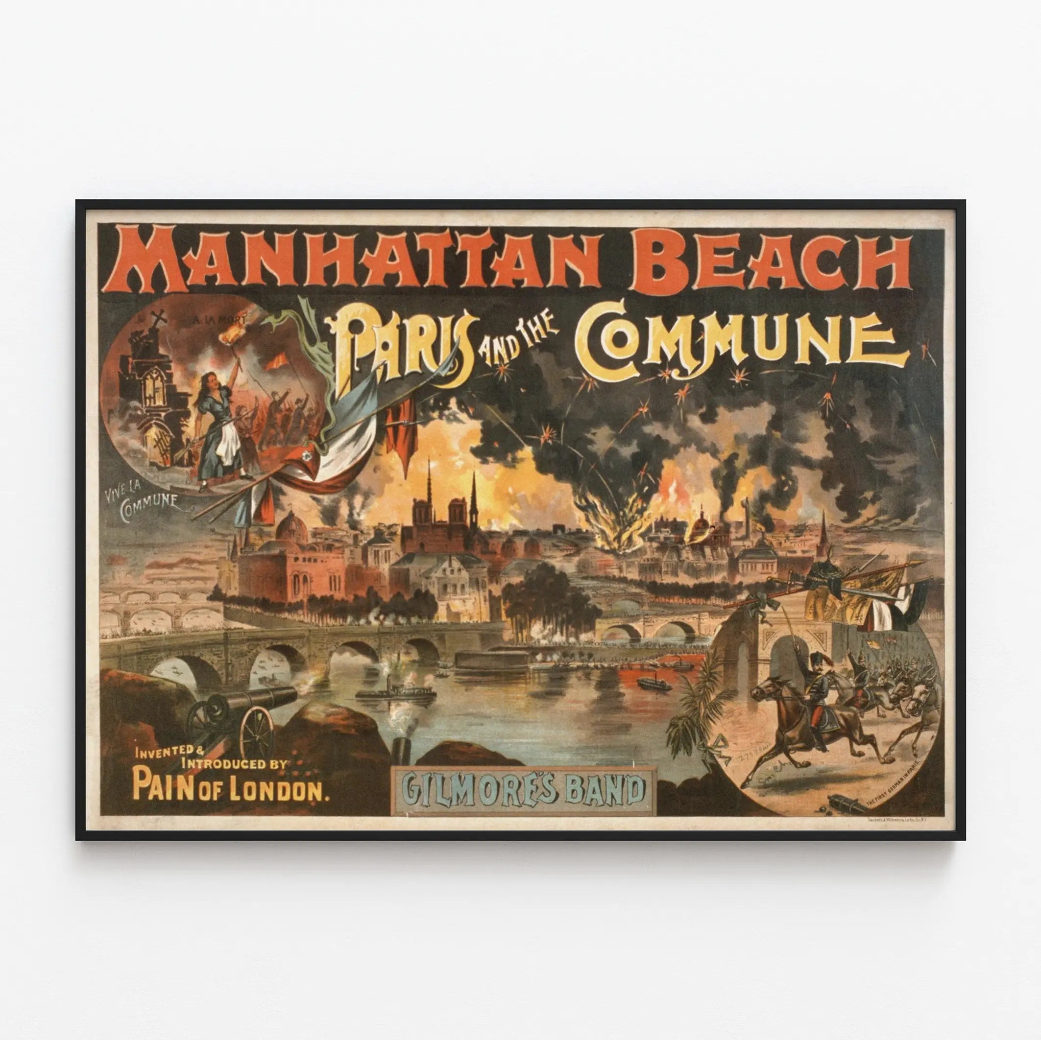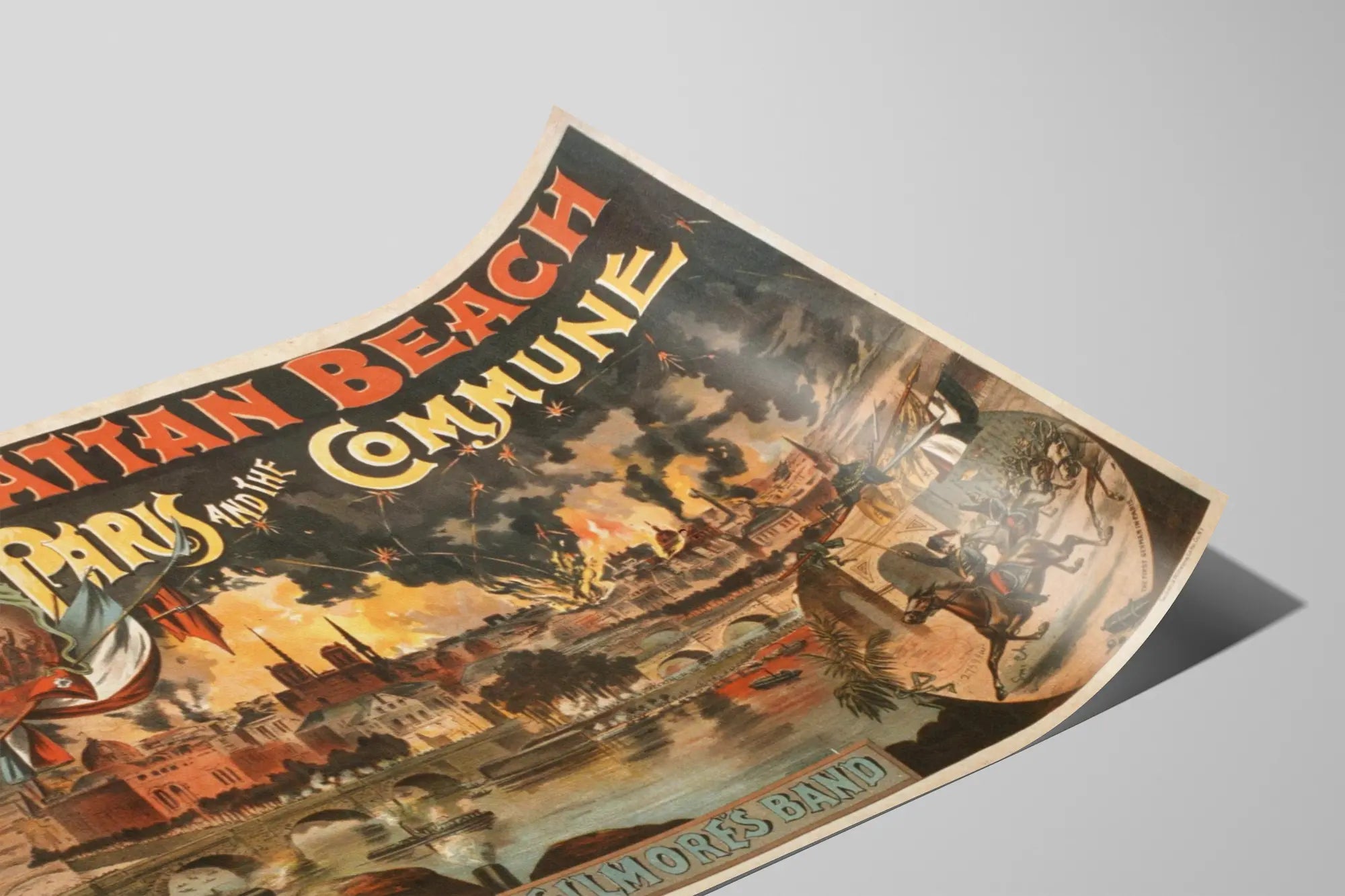 Dieses Vintage-Poster mit dem Titel „Manhattan Beach Paris and the Commune“ ist ein dekoratives Wandstück im alten und eindrucksvollen Stil. Es zeigt eine dramatische Szene von Paris in Flammen, mit ikonischen Gebäuden und Brücken über einem Fluss, unter einem Himmel, der von Rauch und Explosionen erfüllt ist. Im Zentrum zieht die Hauptbeschriftung durch ihre lebendige Typografie, die tiefroten und goldgelben Farbtöne kombiniert, die Aufmerksamkeit auf sich. Oben auf dem Poster hebt ein klarer, imposanter Text den Titel hervor.