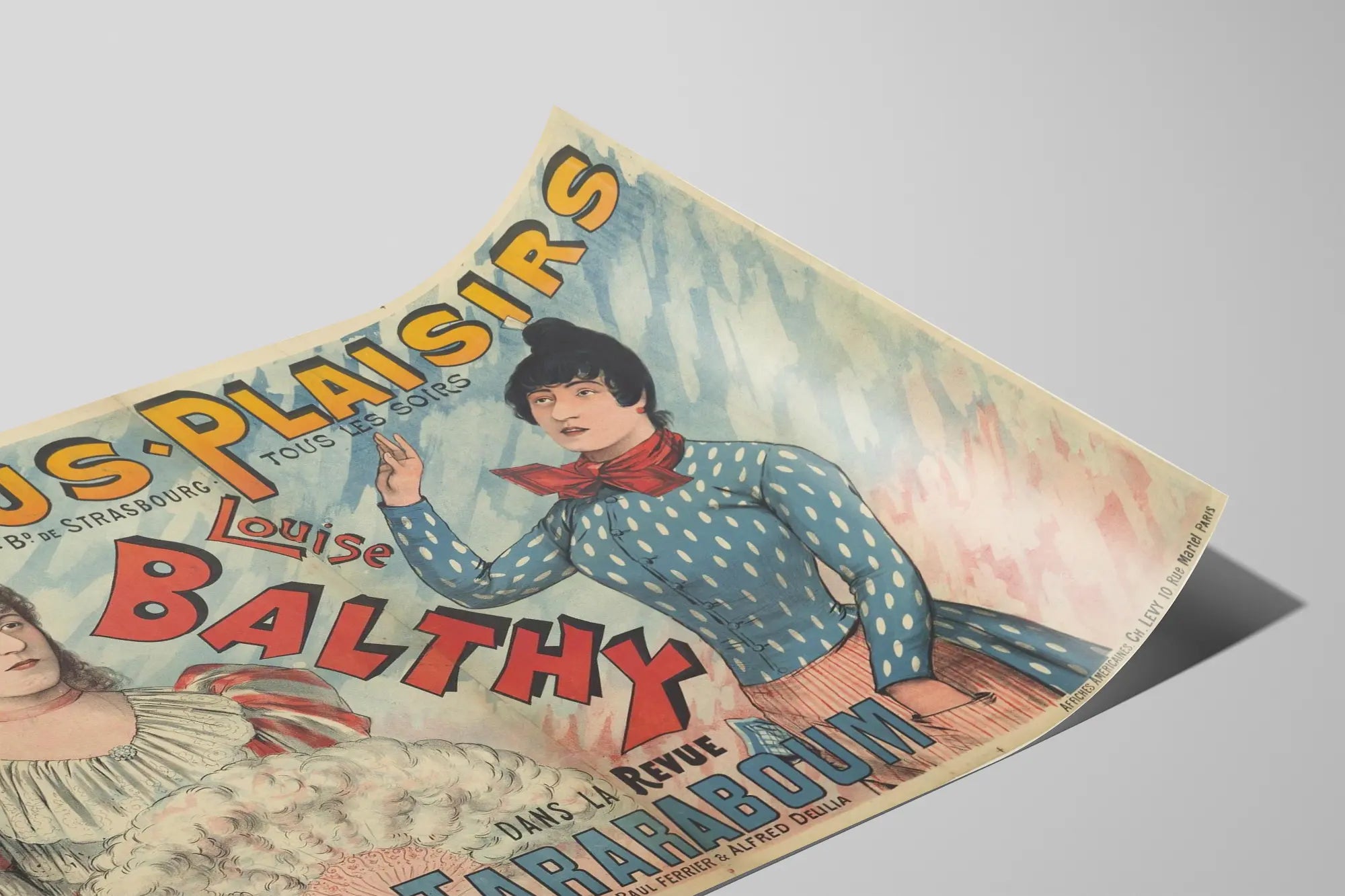 Entdecken Sie dieses authentische Vintage-Poster mit dem Titel „Menüs Plaisirs tous les soirs“, das Louise Balty in der Revue Taraboum zeigt. Dieses historische Werbeplakat ist ein ideales Wanddekorationselement für Liebhaber grafischer Kunst und alter Poster. Sorgfältig reproduziert, zeigt dieses Poster zwei elegante Frauen in historischen Kostümen, mit Pastellfarben und feinen Details, die ein visuell fesselndes Kunstwerk bilden. Dieses Retro-Wandbild spiegelt den Charme und die Ästhetik des Boulevard de Strasbourg wider, eines ikonischen Ortes des Pariser Lebens. Das Poster verleiht jedem Raum eine künstlerische und nostalgische Note, perfekt zur Dekoration eines Wohnzimmers, Esszimmers oder Kulturraums. Sein grafischer Stil und seine sanften Farben machen es zu einem dekorativen Element, das sich harmonisch in verschiedene Inneneinrichtungen einfügt und eine vintage- und raffinierte Atmosphäre schafft. Dieses Wandbild besticht durch seine alten Schriftarten, detaillierten Illustrationen und seinen einzigartigen Charakter, der eine alte Pariser Show evoziert und den Geist einer vergangenen Epoche einfängt. Wandposter, Poster oder Gemälde – diese Kunstdruck ist ideal, um Ihre Wanddekoration zu bereichern oder eine historische und künstlerische Atmosphäre in Ihrem Raum zu schaffen. Eine perfekte Wahl für alle, die ein originelles und charaktervolles Stück suchen, das die Eleganz der Pariser Kulturszene durch Performance und Show symbolisiert.