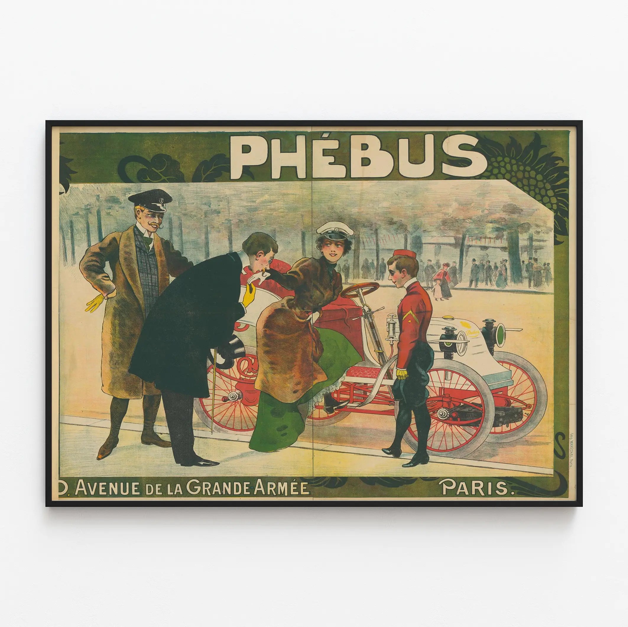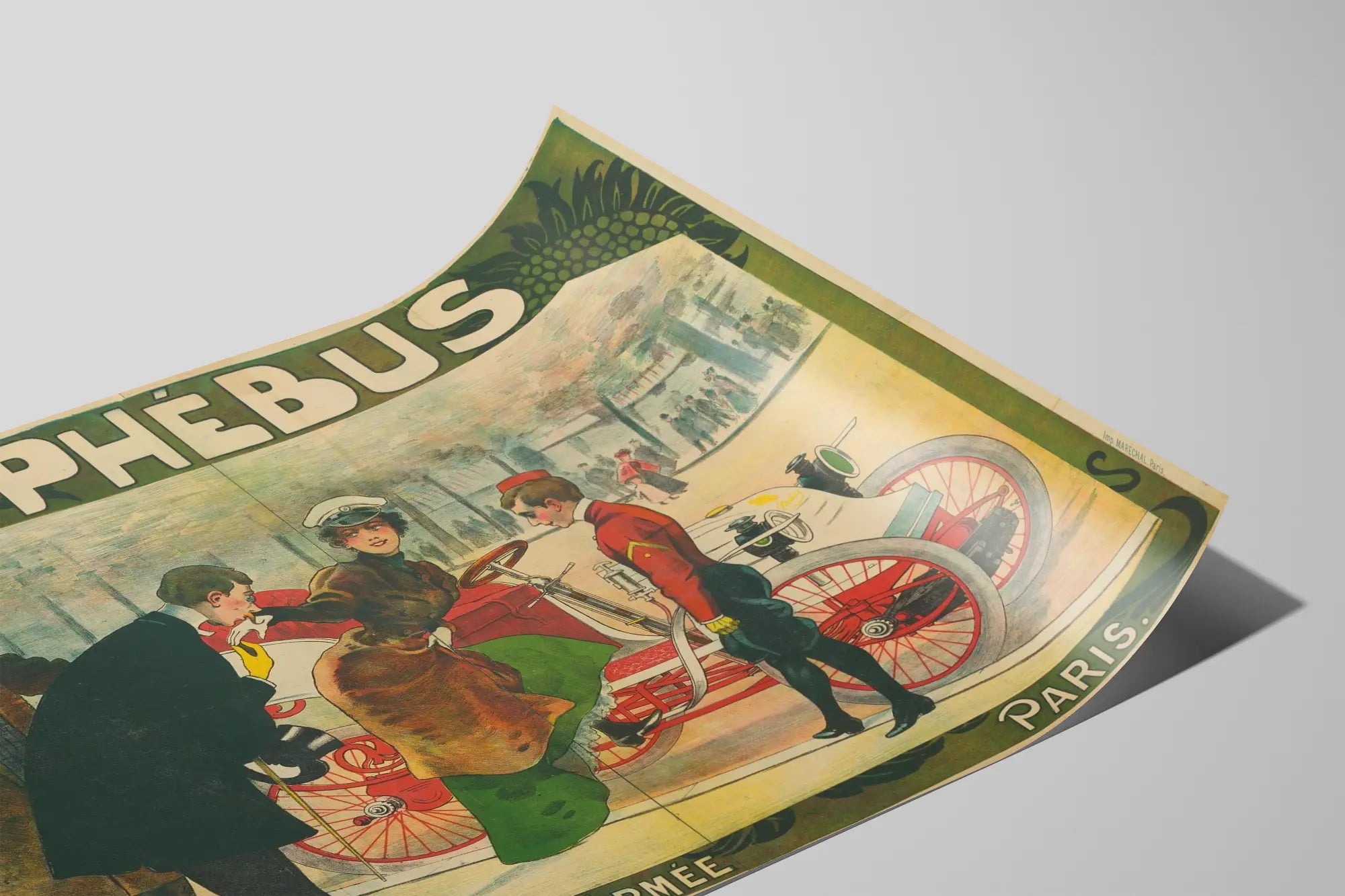 Bringen Sie einen Hauch von Eleganz und Geschichte in Ihre Wanddekoration mit diesem Vintage-Poster mit dem Titel „Phébus Avenue de la Grande Armée Paris“. Dieses Plakat ist ein wahres künstlerisches Zeugnis einer vergangenen Epoche und zeigt eine Szene auf der Avenue de la Grande Armée in Paris. Das Bild zeigt mehrere elegant gekleidete Personen um ein altes rotes und weißes Auto, vor einer markanten Stadtlandschaft mit rauchenden Schornsteinen im Hintergrund, was diesem Wandbild einen unbestreitbaren Charme verleiht.