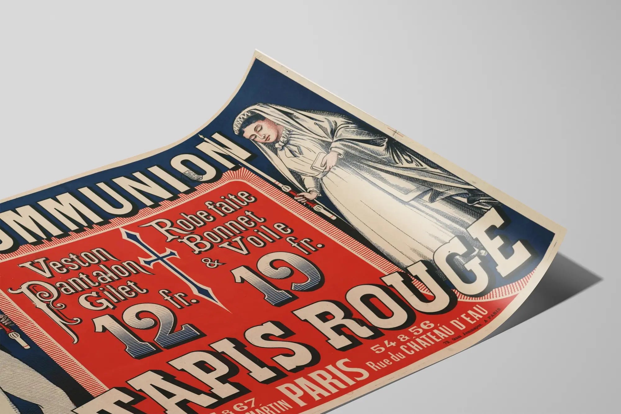 Dieses Vintage-Poster zeigt eine Werbung für Erstkommunion-Kleidung und hebt einen Jungen und ein Mädchen hervor, die jeweils in einem Festtagsanzug bzw. einem festlichen Kleid gekleidet sind, typisch für die erste religiöse Kommunion. Auf einem kontrastreichen blauen und roten Hintergrund präsentiert es die Artikel, die im Geschäft „Zum Roten Teppich“ angeboten werden, gelegen in der Rue du Faubourg Saint-Martin 65-67 in Paris. Der Junge trägt eine Jacke, Hose und Weste, während das Mädchen ein Kleid mit Mütze und Schleier trägt, jeweils eine Kerze haltend, ein traditionelles Symbol dieser Feier. Dieses alte Werbeplakat verbindet stilisierte Grafik mit kräftigen, dekorativen Schriftzügen, wie sie bei Plakaten des frühen 20. Jahrhunderts üblich sind.