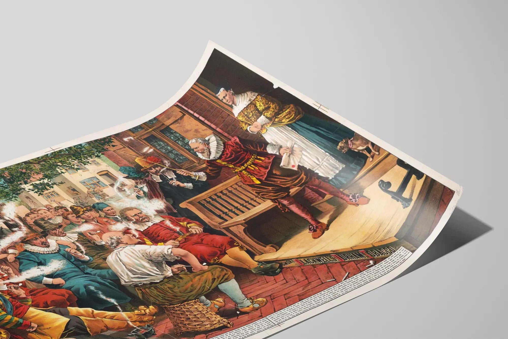 Dieses Vintage-Poster mit dem Titel "Smoke Blackwell's Durham" zeigt einen bedeutenden Vorfall in der Geschichte von New Amsterdam, dem früheren New York. Perfekt für eine einzigartige Wanddekoration fängt diese farbenfrohe Darstellung eine lebendige Szene ein, in der mehrere Figuren des 17. Jahrhunderts Tabak von Blackwell's Durham rauchen. Die Komposition hebt eine Gruppe von Männern in zeitgenössischer Kleidung hervor, einige sitzen, andere stehen, alle produzieren sichtbare Rauchschwaden und unterstreichen die Bedeutung dieser Tabakmarke im Lauf der Geschichte. Im Hintergrund beobachten aufmerksame Passanten die Szene, was die historische Authentizität des Posters verstärkt. Die architektonische Gestaltung und die Möbel, wie die Holzbank, verstärken die Atmosphäre vergangener Zeiten, ideal für einen retro- oder historischen Dekorationsstil. Dieses alte Illustrationsposter passt perfekt in ein Interieur, das einen vintage- und kulturell reichen Stil sucht, sei es im Wohnzimmer, Büro oder Entspannungsraum. Sein präziser Malstil und die lebendigen Farben verleihen eine Note von Eleganz und Authentizität. Das Poster "Smoke Blackwell's Durham" ist eine bemerkenswerte Wahl für Liebhaber klassischer Wanddekoration, amerikanischer Geschichte oder jeden, der sein Zuhause mit einem Werk bereichern möchte, das eine Anekdote aus der Vergangenheit erzählt. In einem passenden Rahmen integriert, trägt dieses dekorative Kunstwerk dazu bei, eine warme und einladende Atmosphäre zu schaffen, indem es Kunst und Erbe verbindet. Dieses Poster lässt sich auch harmonisch mit anderen historischen Postern oder Gemälden kombinieren, um eine thematische Wandkollektion zu bilden.