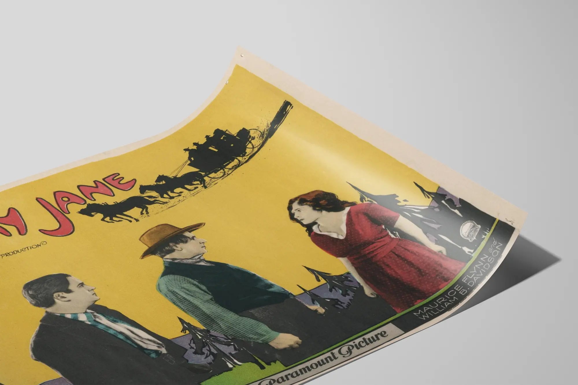 Dieses Vintage-Poster Salomy Jane ist ein einzigartiges Stück, um Ihre Wanddekoration mit einem Hauch von Retro und Kinoästhetik zu verschönern. Präsentiert von Jesse L. Lasky und produziert von George Melford, hebt dieses Poster den Titel "Salomy Jane" in einer imposanten und stilisierten Schrift hervor, die einen leuchtend gelben Hintergrund dominiert und sofort ins Auge fällt. Die grafische Gestaltung wird durch eine illustrierte Szene verstärkt, die eine von Pferden gezogene Kutsche am oberen Rand des Posters zeigt und eine dynamische Atmosphäre im Western- oder Abenteuerstil vermittelt. Im unteren Bereich unterhalten sich drei Figuren in alten Kostümen, wobei eine Farbpalette das Rot des Kleides der Frau und das Braun des Hutes des Mannes in der Mitte betont, während die Silhouetten vor einem Hintergrund stilisierter Tannen in Violett und Grün hervortreten. Dieses Wanddekor im antiken Stil, gedruckt auf leicht gealtertem Papier, erinnert an die Atmosphäre klassischer Filme des frühen 20. Jahrhunderts. Es eignet sich perfekt für Liebhaber von Kinopostern und Vintage-Innendekorationen und verleiht Ihrem Raum eine künstlerische und erzählerische Note. Dieses Poster als Wandbild oder Gemälde in einem Wohnzimmer, einer Bibliothek oder einem Büro aufzuhängen, schafft einen originellen Blickfang mit Geschichte. Ideal für eine Dekoration im Stil alter Filme oder eine Sammlung von Filmplakaten, unterstreicht dieses Motiv den Charme der Produktionen von Paramount Pictures und die visuelle Ästhetik der Filmplakate dieser Epoche.