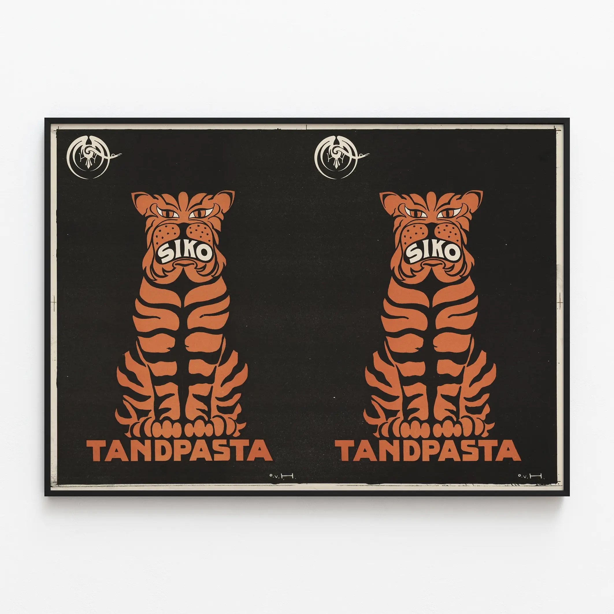 Dieses Vintage-Poster zeigt eine doppelte Illustration eines stilisierten Tigers in Orange vor einem intensiven schwarzen Hintergrund, mit dem Wort „SIKO“ in den Mund des Tieres geschrieben und „TANDPASTA“ in Großbuchstaben unter jedem Tiger. Dieses Werbeplakat hebt grafisch und eindrucksvoll das Produkt „Siko Tandpasta“, eine Zahnpasta, hervor. Das schlichte Design und die kontrastreichen Farben dieses Wanddekors machen es zu einem bemerkenswerten visuellen Kunstobjekt für ein modernes oder retro-inspiriertes Interieur. Die kantigen Linien und der geometrische Stil des Tigers verleihen Ihrem Raum eine Note von Originalität und Authentizität. Perfekt für Liebhaber alter Poster und Vintage-Werbungen, unterstreicht dieses Plakat die Verbindung zwischen Kraft und Zahnschutz, symbolisiert durch den Tiger. Als dekoratives Element in Bad, Büro oder Wohnzimmer eingesetzt, verleiht dieses Druckbild Ihrer Wand eine einzigartige, nostalgische Atmosphäre. Seine symmetrische Doppelkomposition verstärkt die visuelle Wirkung und macht es ideal für ein Design- oder Pop-Art-Ambiente. Mit der Wahl dieses klassischen Werbeplakats investieren Sie in ein Wanddekorationselement, das grafische Geschichte mit kühner Ästhetik verbindet – perfekt, um Ihre Wände mit Charakter und Stil zu personalisieren.