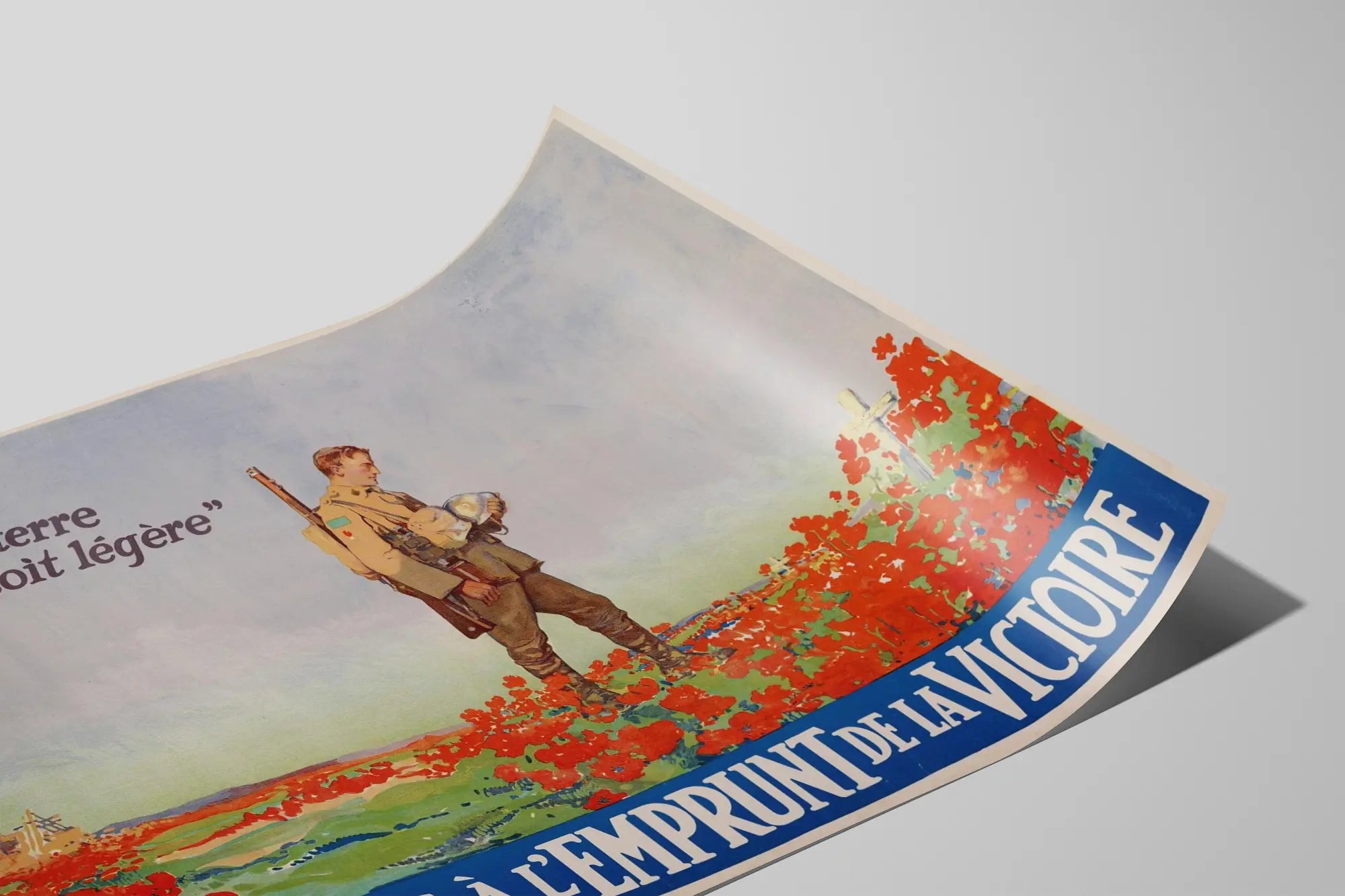 Dieses vintage Wandposter zeigt einen Soldaten in Militäruniform, stehend in einem Feld roter Mohnblumen, einer symbolischen Blume, die oft mit dem Gedenken an gefallene Soldaten verbunden ist. Das Werk trägt die Phrase „Damit die Erde ihnen leicht sei“ oben links, was an die Erinnerung und den Respekt gegenüber jenen erinnert, die ihr Leben gegeben haben. Unten befindet sich ein breiter blauer Streifen mit der Botschaft „Unterzeichnen wir den Sieg-Loan“, der dazu einlädt, die Kriegsanstrengungen finanziell zu unterstützen, um den Sieg zu erreichen. Dieses Poster ist Teil einer patriotischen und gedenkenden Ästhetik, die lebendige Farben und eine harmonische Komposition vereint. Der klare, beruhigende Himmel im Hintergrund bildet einen Kontrast zu den lebhaften Tönen des Feldes und schafft eine Atmosphäre der Ruhe und Besinnung. Diese Wanddekoration verleiht jedem Raum eine historische und feierliche Note, ideal für Liebhaber historischer Erinnerungen oder Themen rund um Krieg und Gedenken. Perfekt, um ein Büro, eine Bibliothek oder einen Wohnraum mit einer Geschichte und Emotionen aufgeladenen Atmosphäre zu schmücken. Dieses Wandbild im Retro-Design bleibt eine eindrucksvolle visuelle Hommage an die Opfer der Soldaten und unterstreicht die Bedeutung des Gedenkens durch ein starkes, symbolisches Bild.