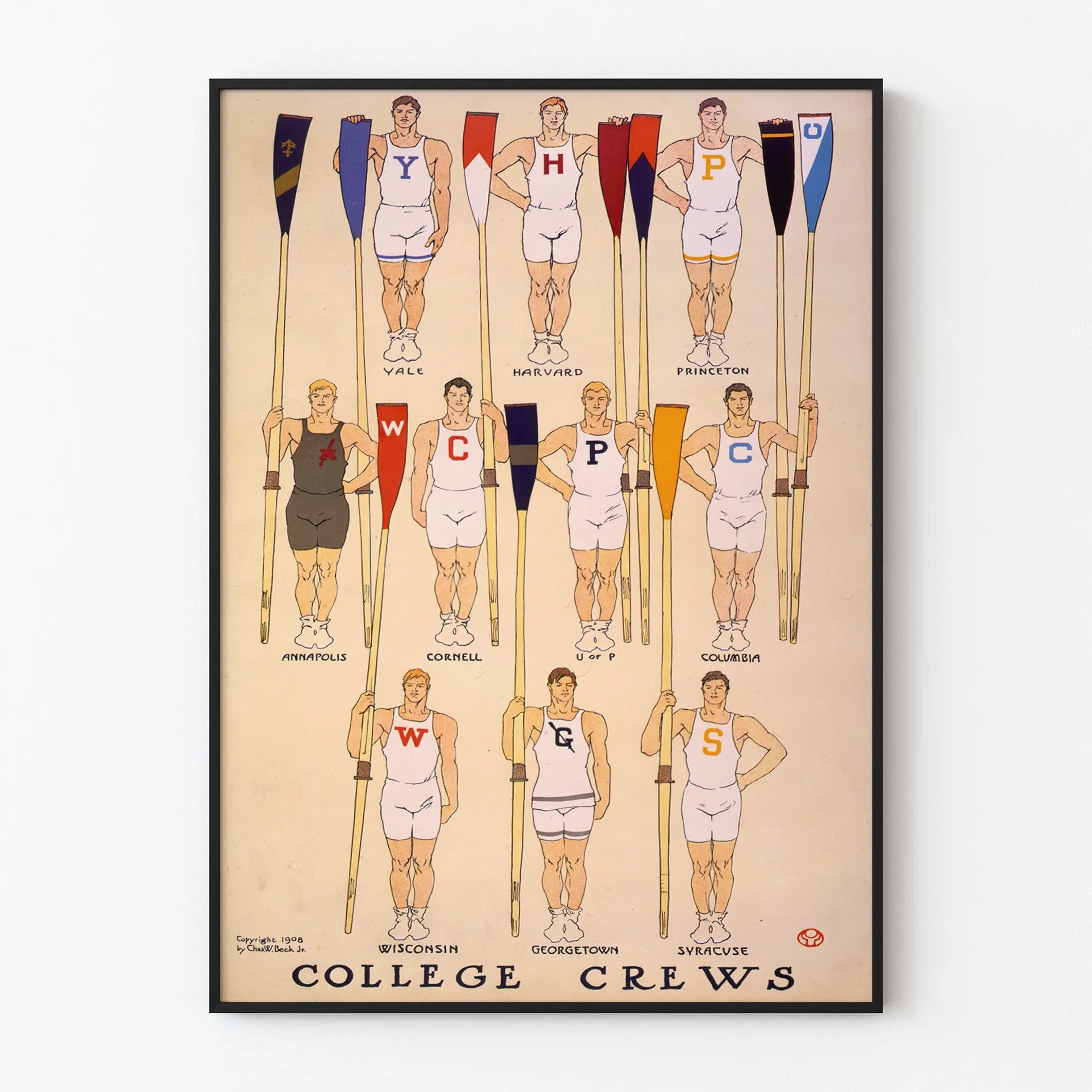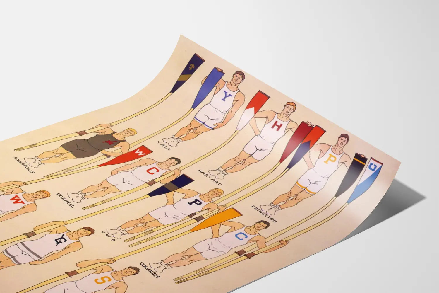 Bringen Sie einen Hauch von Retro-Eleganz in Ihre Wanddekoration mit diesem Vintage-Poster, das die Ruderteams großer amerikanischer Universitäten zeigt. Präzise und sorgfältig illustriert, zeigt dieses farbenfrohe Plakat elf Ruderer in weißen oder dunklen Anzügen, die jeweils eine Pagaie mit den Initialen und Farben von Universitäten wie Yale, Harvard, Princeton, Annapolis, Cornell, Columbia und anderen halten. Jeder Ruderer ist in einer stolzen, aufrechten Haltung dargestellt, die die Kraft und den Teamgeist symbolisiert, die für diesen Ausdauersport typisch sind. Dieses Poster ist ein ideales Wanddekorationselement für Sportliebhaber, Geschichtsinteressierte oder jene, die ihrem Interieur einen klassischen und sportlichen Stil verleihen möchten. Sein grafischer Stil aus den frühen 20. Jahrhunderts, datiert auf 1908, verleiht ihm einen authentischen Charme, der sowohl in modernen als auch in traditionellen Umgebungen geschätzt wird. Leicht einzurahmen, kann dieses dekorative Bild sowohl in einem Büro, einem Wohnzimmer als auch in einem Fitnessraum integriert werden. Es ist auch ein hervorragendes Geschenk für Ruderbegeisterte, Studierende oder Nostalgiker amerikanischer Elite-Universitäten. Zusammenfassend ist dieses Poster viel mehr als nur eine Wanddekoration – es ist eine visuelle Feier der Disziplin und Geschichte des Hochschulsports, perfekt geeignet für ein zeitgenössisches oder vintage-inspiriertes Interieur.