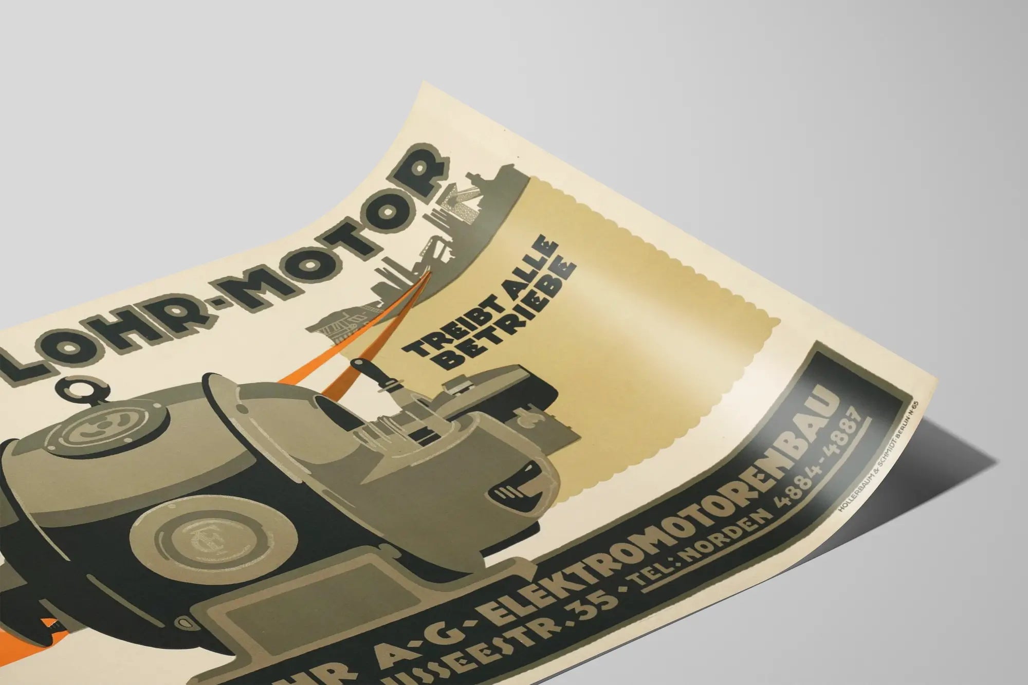 Dieses vintage Werbeplakat hebt den Flohr-Motor hervor, hergestellt von der Firma Carl Flohr A.G., die sich auf den Bau von Elektromotoren in Berlin spezialisiert hat. Mit dezenten Farben, dominiert von Grautönen, Schwarz und orangefarbenen Akzenten, fängt diese industrielle Wanddekoration den Geist und die Ästhetik alter technischer Plakate ein. Der Motor ist im Mittelpunkt des Plakats in Nahaufnahme dargestellt, wobei seine robusten mechanischen Formen präzise gezeigt werden, während im Hintergrund eine Silhouette von Fabriken angedeutet wird, was die industrielle Nutzung des Flohr-Motors unterstreicht. Dieses Wandplakat ist ideal für eine Inneneinrichtung im industriellen oder Vintage-Stil und verleiht einem modernistischen oder retro Raum eine authentische Note technischer Ingenieurskunst und technischer Geschichte. Perfekt als dekoratives Poster für Liebhaber technischer Gestaltung, industrieller Geschichte oder seltener Objekte. Dieses Motiv inspiriert sowohl durch Funktionalität als auch durch mechanische Ästhetik. Der deutlich sichtbare deutsche Text betont den Retro- und Authentizitätsstil dieser Wanddekoration und enthält die Adresse sowie die Kontaktdaten des Unternehmens, was den historischen Charakter verstärkt. Als dekoratives Plakat lässt es sich in Arbeitsräume, Werkstätten, urbane Lofts oder moderne Wohnzimmer integrieren, die Objekte mit Geschichte schätzen. Dieses Poster besticht durch eine geometrische Gestaltung, die Einfachheit mit visueller Effektivität verbindet, wobei vintage Typografie und technische Illustration kombiniert werden. Es ist eine ausgezeichnete Wahl für diejenigen, die ihrer Wanddekoration eine einzigartige und erzählerische Note verleihen möchten, die an die Anfänge der deutschen Industrierevolution und die Kraft der Elektromotoren jener Zeit erinnert. Dieses Plakat in Ihre Sammlung oder Dekoration zu integrieren bedeutet, ein Stück industrieller Geschichte wieder lebendig werden zu lassen und den Raum durch seine beeindruckende und anspruchsvolle grafische Gestaltung aufzuwerten.