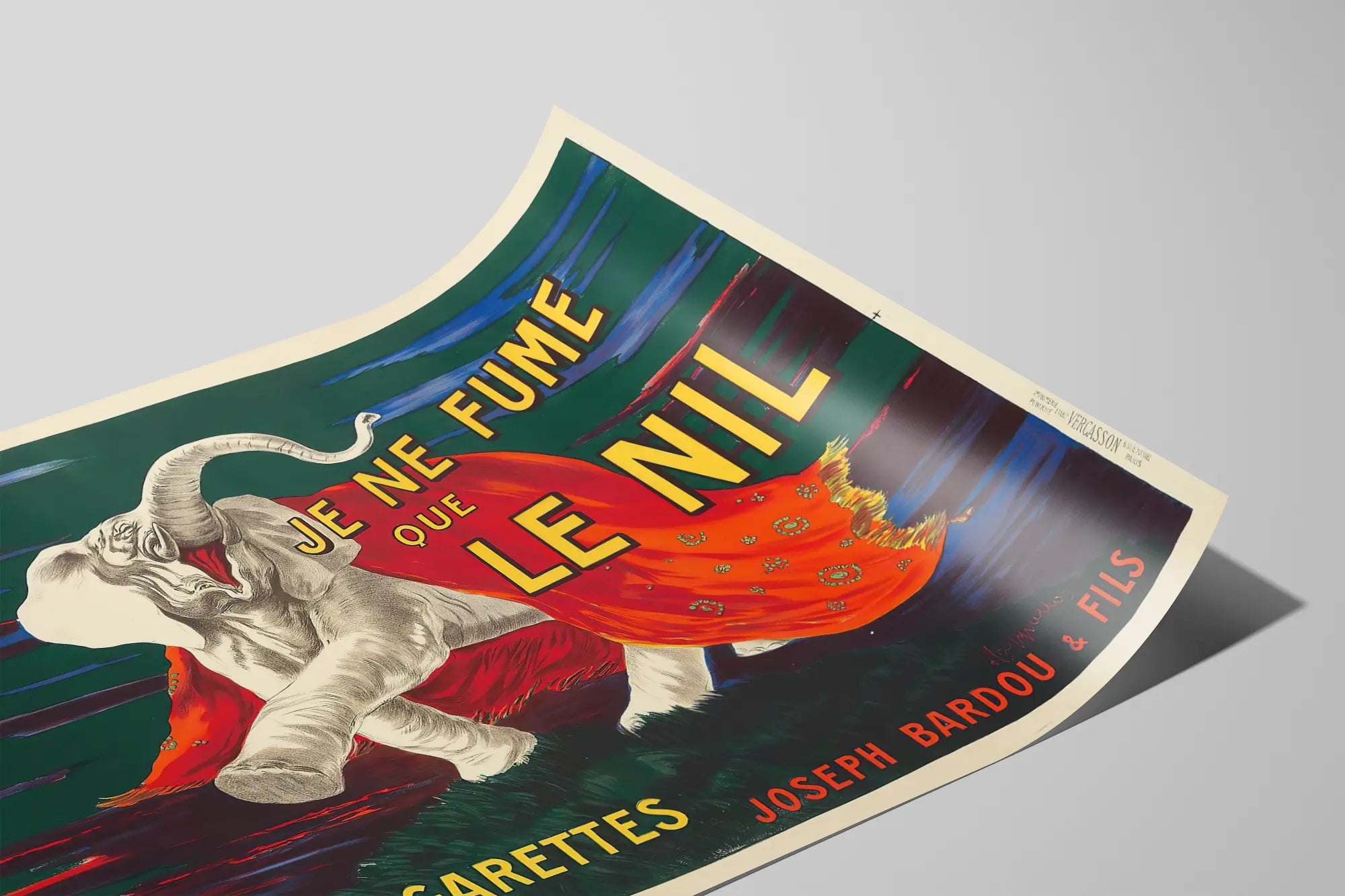 Dieses vintage Werbeplakat zeigt einen majestätischen Elefanten, der in einem leuchtend roten Mantel gehüllt ist, und bewirbt das Zigarettenpapier „Ich rauche nur den Nil“. Diese Wanddekoration fasziniert durch ihren farbenfrohen grafischen Stil und ihre dynamische Komposition, die natürliche Elemente mit kühner Typografie verbindet. Der Elefant, das zentrale Motiv des Plakats, ist mit einer Detailgenauigkeit gezeichnet, die seinen Ausdruck und seine imposante Haltung hervorhebt und dem Werk eine verspielte und exotische Note verleiht. Der dunkelgrüne Hintergrund wird durch Akzente in Rot- und Blautönen lebendig, was dem Gesamtbild Tiefe und Kontrast verleiht. Der Text in gelben und roten Großbuchstaben zieht sofort die Aufmerksamkeit auf sich und verstärkt die Werbebotschaft. Dieses Plakat ist ideal für eine originelle Wanddekoration, die einen Retro-Charme und einen Vintage-Look in ein modernes oder klassisches Interieur bringt. Perfekt für Liebhaber von Grafikdesign, alten Werbungen oder Tiermotiven, fügt sich dieses Werk in verschiedene Umgebungen ein, wie Wohnzimmer, Büro oder Entspannungsraum. Sein horizontaler Format bietet eine einfache Möglichkeit, es an einer Wand zur Geltung zu bringen, mit einem perfekten Gleichgewicht zwischen Illustration und Text. Dieses Werbeplakat vermittelt eine vergangene Ästhetik, die von Geschichte und Charme durchdrungen ist, und verleiht zugleich einen markanten dekorativen Akzent. Die Wahl dieses Bildes zur Wandgestaltung bedeutet, ein Stück zu wählen, das die Fantasie anregt und durch eine kraftvolle, farbenfrohe Bildsprache Neugier weckt.