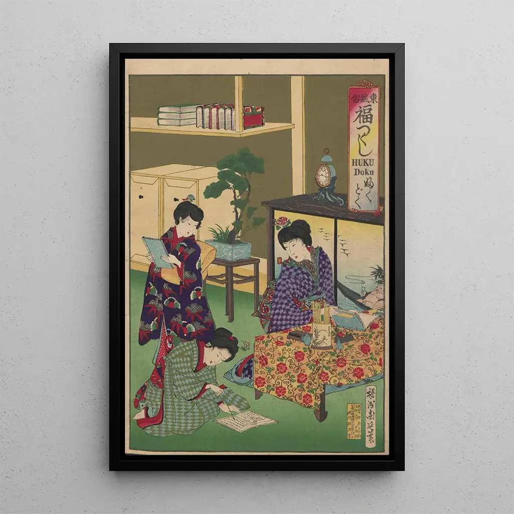 Das Werk "L'Album de Nishikie Pl11" von Toyohara Chikanobu ist eine wahre Feier der flüchtigen Schönheit der Welt. Dieser kunstdruck besticht durch seine lebendigen Farben und seine detaillierten Feinheiten, die die Essenz des täglichen Lebens im Japan der Edo-Zeit einfangen. Die Figuren, gekleidet in reich verzierte Kimonos, scheinen auf der Leinwand zum Leben zu erwachen, während die floralen Muster und die Landschaften im Hintergrund eine poetische Dimension zur Szene hinzufügen. Die Technik des Holzschnitts auf Papier, charakteristisch für Chikanobu, ermöglicht eine Tiefe und Helligkeit, die das Werk besonders fesselnd machen. Jeder Blick auf diesen kunstdruck lädt zu einer Betrachtung der Feinheiten der japanischen Kultur ein.