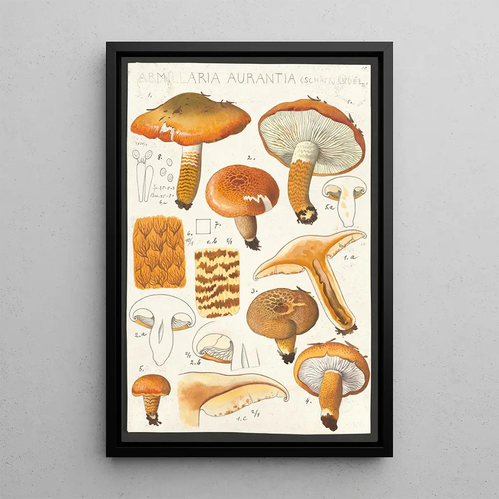 Die Reproduktion von "Armillaire aurantie Schaeffer Quél" ist ein dekoratives Stück, das jeden Raum bereichern kann, sei es ein Wohnzimmer, Büro oder Schlafzimmer. Die Druckqualität garantiert eine bemerkenswerte Treue zu den Details des Originalwerks, sodass man seine ästhetische Anziehungskraft voll genießen kann. Dieses Bild lädt zur Reflexion und Kontemplation ein und verleiht Ihrem Interieur gleichzeitig einen Hauch von Eleganz und Geheimnis. Mit der Wahl dieses Leinwandbildes entscheiden Sie sich für ein Werk, das nicht nur Ihre Dekoration verschönert, sondern auch das Interesse und die Neugier Ihrer Gäste weckt.