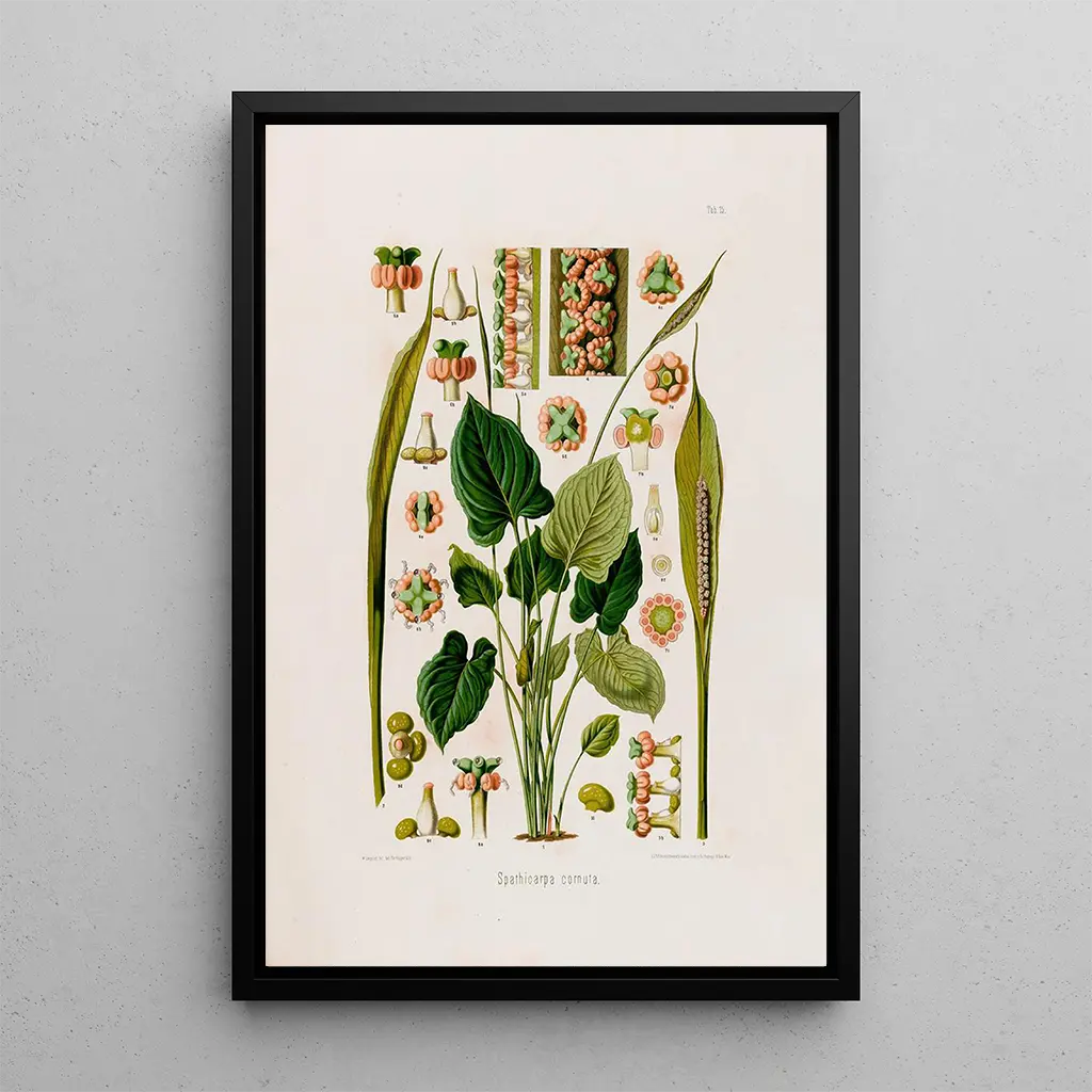 Aroideae Maximilianae Pl15 : ein Tanz aus Formen und Farben Das Werk "Aroideae Maximilianae Pl15" von Heinrich Wilhelm Schott entfaltet sich wie eine wahre Ode an die Natur. Die lebendigen Nuancen von Grün, Gelb und Violett verschmelzen zu einem faszinierenden Bild dieser Pflanze. Die Präzision der Details, typisch für botanische Illustrationen, ermöglicht es, jede Nervatur der Blätter und die Zartheit der Blüten zu bewundern. Die Atmosphäre, die von dieser kunstdruck ausgeht, ist sowohl beruhigend als auch anregend und lädt den Betrachter ein, in die üppige Welt der tropischen Flora einzutauchen. Jedes Element wird sorgfältig hervorgehoben, wodurch eine visuelle Harmonie entsteht, die das Auge fesselt. Heinrich Wilhelm Schott : ein Pionier der botanischen Illustration Heinrich Wilhelm Schott, Botaniker und Illustrator des 19. Jahrhunderts, widmete sein Leben der Erforschung tropischer Pflanzen, insbesondere der Familien der Aroideae. Seine Arbeit wurde durch die botanischen Expeditionen seiner Zeit beeinflusst, die von einem Wunsch nach Klassifikation und Verständnis der Biodiversität geprägt waren. Schott trug nicht nur zur botanischen Wissenschaft bei, sondern verstand es auch, die Schönheit der Pflanzen durch seine Illustrationen einzufangen. Sein Erbe besteht fort, denn seine Werke inspirieren weiterhin Botanik- und Kunstliebhaber. "Aroideae Maximilianae Pl15" ist ein perfektes Beispiel für sein Talent, das wissenschaftliche Präzision mit künstlerischer Sensibilität verbindet. Eine dekorative Anschaffung mit vielfältigen Vorzügen Der kunstdruck "Aroideae Maximilianae Pl15" ist ein dekoratives Stück, das jeden Raum bereichern kann, sei es ein Wohnzimmer, ein Büro oder ein Schlafzimmer. Die Druckqualität garantiert eine Treue zu den Farben und Details des Originalwerks, wodurch dieses Leinwandbild zu einem echten Blickfang wird. Die ästhetische Anziehungskraft dieser botanischen Illustration bringt einen Hauch von Natur und Eleganz in Ihr Zuhause. Mit der Wahl dieses kunstdrucks entscheiden Sie sich für eine Dekoration, die die Schönheit der natürlichen Welt widerspiegelt und gleichzeitig eine künstlerische Dimension in Ihre Umgebung bringt.
