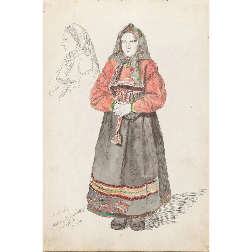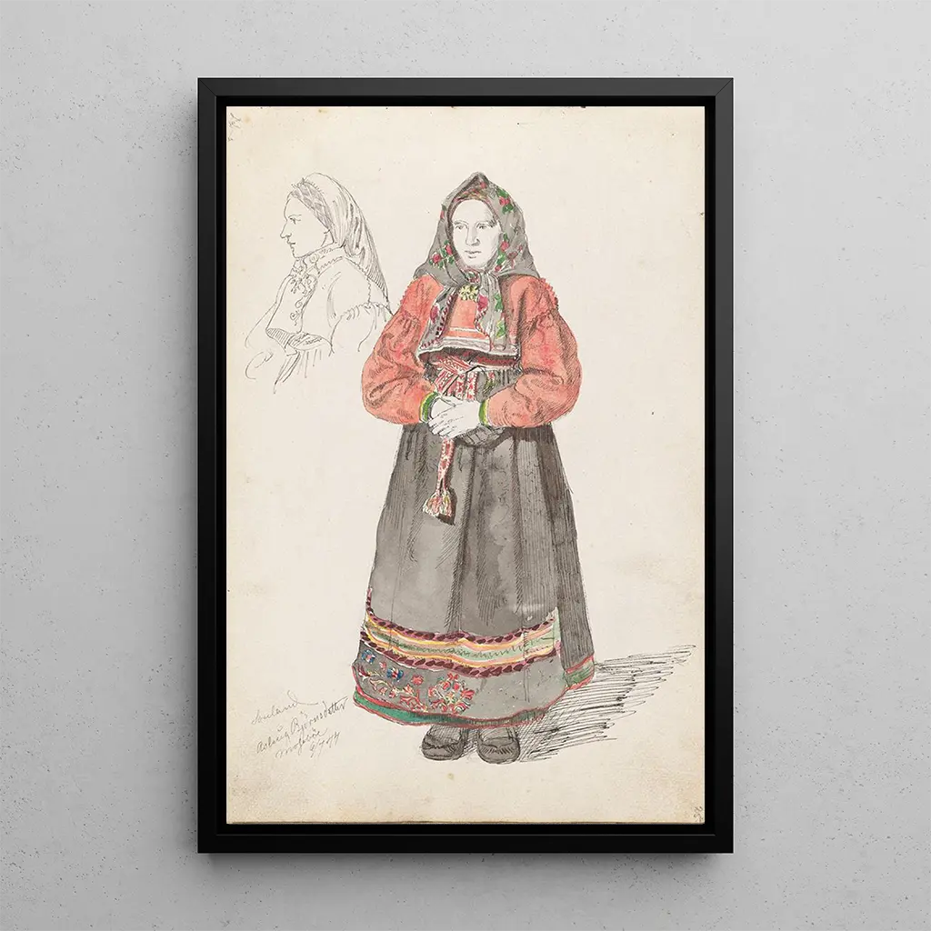 Aslaug Bjørnsdatter Moseb Sauland : eine Hommage an die norwegische Tradition „Aslaug Bjørnsdatter Moseb Sauland“ ist ein kunstdruck von Adolph Tidemand, der die Schönheit der norwegischen Traditionen durch das Porträt einer Frau mit entschlossenem Blick feiert. Die Komposition hebt detaillierte Elemente hervor, wie die Stickereien ihres Kleides und die typischen Accessoires ihrer Zeit, und schafft eine authentische und warme Atmosphäre. Die lebendigen Farben und die zarten Nuancen der Leinwand spiegeln den Reichtum der skandinavischen Kultur wider, während Tidemand’s Technik, die Realismus und Romantik verbindet, dieser ikonischen Figur Leben einhaucht. Dieses Kunstwerk lädt zu einer Reflexion über die Identität und die Rolle der Frauen in der norwegischen Gesellschaft des 19. Jahrhunderts ein. Adolph Tidemand : ein Pionier des romantischen Realismus Adolph Tidemand, geboren 1814, gilt als einer der führenden Künstler der romantischen Bewegung in Norwegen. Seine Karriere war geprägt von dem Wunsch, das ländliche Leben und die Volksbräuche darzustellen, oft inspiriert durch seine Reisen durch das Land. Tidemand studierte in Kopenhagen, wo er von den großen Meistern des Realismus beeinflusst wurde. Seine Werke, wie „Aslaug Bjørnsdatter Moseb Sauland“, spiegeln eine tiefe Bewunderung für die Natur und die norwegischen Bräuche wider, während sie gleichzeitig die Würde der dargestellten Figuren betonen. Dieses Kunstwerk ist Teil einer Serie von Werken, die das kulturelle Erbe seines Landes feiern. Eine dekorative Reproduktion mit vielfältigen Vorzügen Der Kunstdruck von „Aslaug Bjørnsdatter Moseb Sauland“ ist eine ideale Wahl für alle, die ihre Inneneinrichtung bereichern möchten. Ob im Wohnzimmer, Schlafzimmer oder Büro – diese Leinwand verleiht jedem Raum eine Note von Authentizität und Charme. Die Qualität der Reproduktion garantiert eine Treue zu den Details und Farben des Originalwerks, sodass die Emotionen, die Tidemand vermitteln wollte, spürbar werden. Die ästhetische Anziehungskraft dieses Kunstwerks liegt in seiner Fähigkeit, Geschichten zu erzählen und eine warme Atmosphäre zu schaffen. Durch die Integration dieses Kunstdrucks in Ihre Dekoration verleihen Sie Ihrem Raum eine einzigartige künstlerische und kulturelle Dimension.