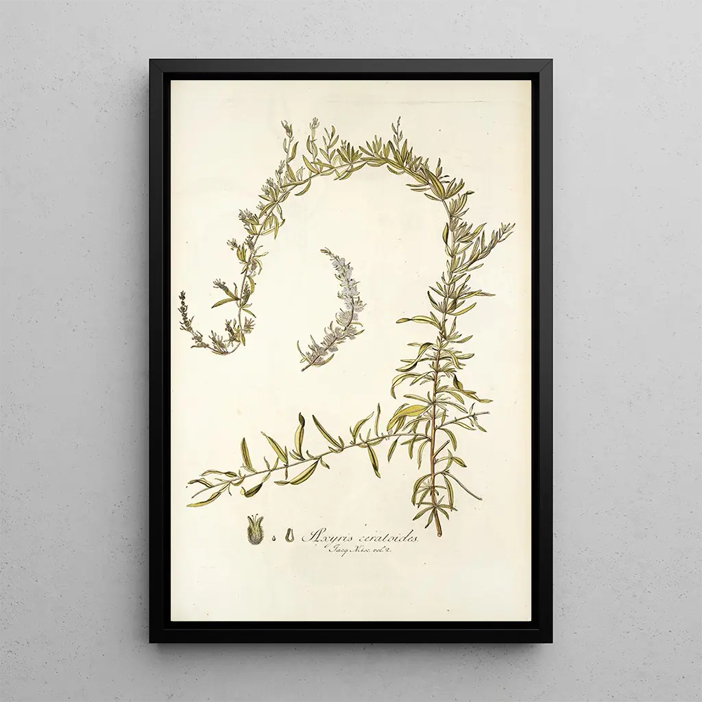 Axyris ceratoides : eine Ode an die exotische Natur Das Werk "Axyris ceratoides" von Nikolaus Joseph Freiherr von Jacquin entführt uns in eine faszinierende botanische Welt. Dieser kunstdruck hebt eine seltene Pflanze hervor, deren lebendige Farben und feine Details die Essenz der natürlichen Schönheit einfangen. Die Aquarelltechnik, meisterhaft angewandt, schafft eine Atmosphäre, die zugleich zart und lebendig ist und den Betrachter einlädt, jede Nuance des Blattes und der Blüte zu erkunden. Die grünen und gelben Töne verschmelzen harmonisch und vermitteln ein Gefühl von Frische und Gelassenheit, als befände man sich im Herzen eines üppigen Gartens. Nikolaus Joseph Freiherr von Jacquin, Botaniker und Künstler des 18. Jahrhunderts, spielte eine entscheidende Rolle bei der Dokumentation exotischer Pflanzen. Seine Reisen nach Südamerika und in die Karibik bereicherten sein botanisches Wissen und beeinflussten seinen künstlerischen Stil. Als Mitglied der Akademie der Wissenschaften trug er zur Verbreitung von Kenntnissen über die Flora der Welt bei. Sein Werk ist Teil der Bewegung der botanischen Illustration, die Wissenschaft und Kunst verbindet, und zeugt von der Bedeutung sorgfältiger Beobachtung bei der Darstellung von Pflanzenarten. "Axyris ceratoides" ist ein emblematisches Beispiel für diese Verbindung von wissenschaftlicher Strenge und künstlerischer Sensibilität. Eine dekorative anschaffung mit vielfältigen vorteilen Der kunstdruck von "Axyris ceratoides" ist eine ideale Wahl, um Ihr Zuhause zu verschönern, sei es im Wohnzimmer, Büro oder Schlafzimmer. Die Druckqualität garantiert eine außergewöhnliche Farbtreue und Detailgenauigkeit des Originalwerks und verleiht Ihrer Dekoration einen Hauch von Eleganz und Raffinesse. Dieses Bild lädt zur Betrachtung und Flucht in eine andere Welt ein, während es gleichzeitig eine Note natürlicher Frische in Ihren Raum bringt. Mit seinem unbestreitbaren ästhetischen Reiz wird dieser Leinwanddruck Kunstliebhaber und Botaniker gleichermaßen begeistern und sich harmonisch in verschiedene Einrichtungsstile integrieren lassen.