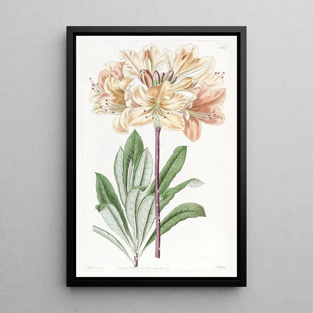 Die chinesische gelbe Azalee, ein zartes Werk von Sydenham Edwards, erinnert an die vergängliche Schönheit eines blühenden Frühlings. Diese kunstdruck hebt lebendige Gelb- und Grüntöne hervor und schafft eine helle, fröhliche Atmosphäre. Die Aquarelltechnik, mit ihren zarten Nuancen und subtilen Farbverläufen, ermöglicht es, die Leichtigkeit der Blütenblätter einzufangen, die fast in der Luft zu schweben scheinen. Jedes Detail ist sorgfältig wiedergegeben, von den Blattnerven bis zu den Schattenwürfen, und lädt zur Betrachtung der Natur ein.