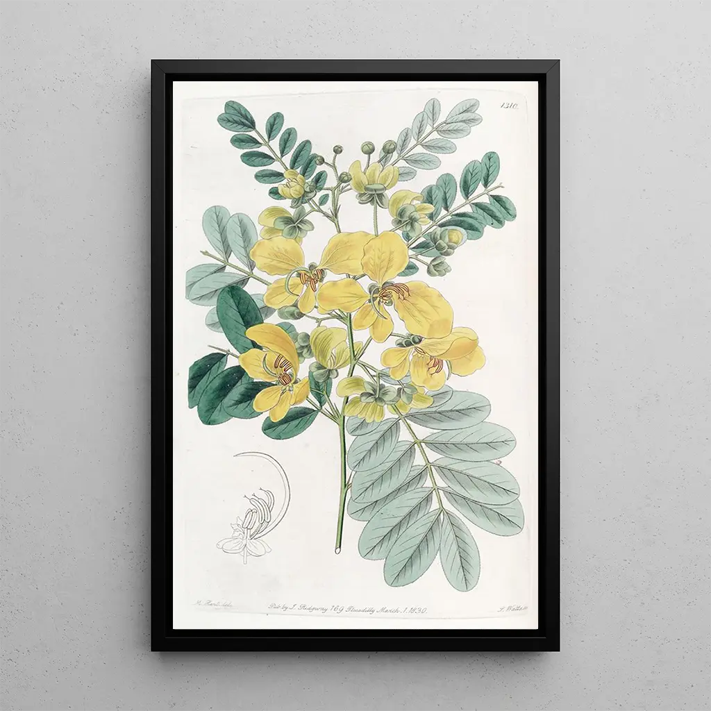 Cassia mit zwei Blüten ist ein faszinierendes Kunstwerk, das die Pracht der Pflanzen durch detaillierte Feinheiten und leuchtende Farben offenbart. Die goldenen und grünen Töne verbinden sich zu einer harmonischen Komposition, die den Blick anzieht. Die Gravurtechnik von Sydenham Edwards ermöglicht es, jede Blüte mit beeindruckender Präzision darzustellen und eine Atmosphäre von Gelassenheit und natürlicher Schönheit zu vermitteln. Dieser kunstdruck lädt zum Staunen ein und bietet einen Einblick in die Vielfalt der tropischen Flora und ihre zeitlose Eleganz.