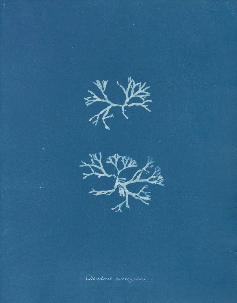 Der Stil von Anna Atkins zeichnet sich durch einen einzigartigen Ansatz der Fotografie aus, den sie in einer Zeit entwickelte, in der diese Technik noch am Anfang stand. Durch die Reproduktion von Chondrus norvegicus erkennt man eine Meisterschaft im Umgang mit Kontrasten und Texturen, die der inneren Schönheit der Alge huldigt. Die Komposition ist sowohl schlicht als auch ausdrucksstark und hebt die organischen Formen sowie die zarten Nuancen des fotografierten Objekts hervor. Jedes Detail wird sorgfältig betont, was eine visuelle Harmonie schafft, die zur Kontemplation einlädt. Der Einsatz der Cyanotypie, einer Drucktechnik, die Bilder in einem tiefen Blau erzeugt, verleiht dem Werk eine Atmosphäre, die sowohl ruhig als auch geheimnisvoll ist. Diese technische Wahl spiegelt Atkins' Wunsch wider, Wissenschaft und Kunst zu verschmelzen und so eine poetische Sicht auf die Natur zu bieten.