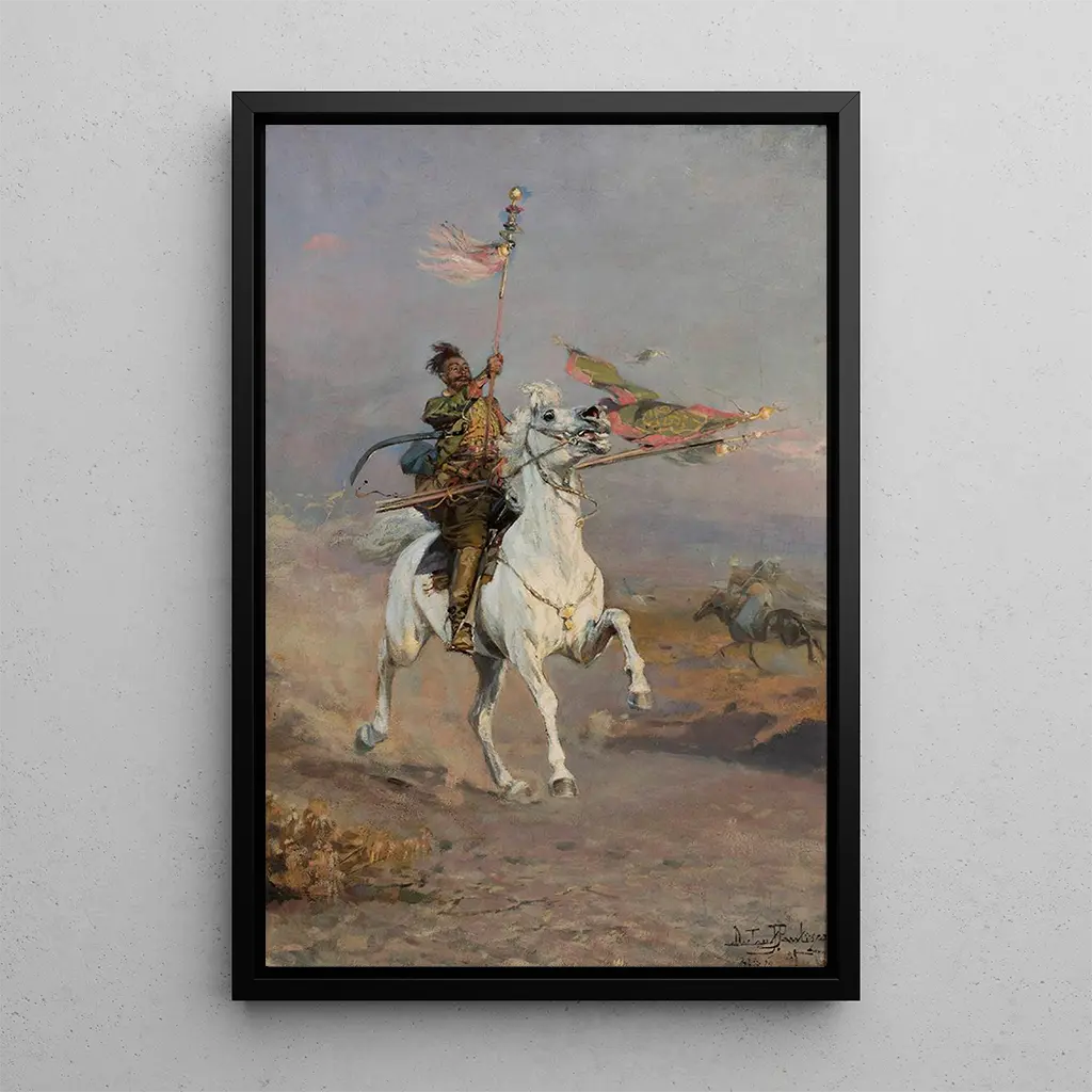 Conquête de l'étendard : eine Ode an Mut und Entschlossenheit Die reproduction des Gemäldes "Conquête de l'étendard" von Wacław Pawliszak zeigt eine lebendige Szene voller Mut und Eroberung. Die warmen Farben, die leuchtende Rottöne und strahlende Goldtöne mischen, schaffen eine dynamische und fesselnde Atmosphäre. Die Technik des Künstlers, der energische Pinselstriche verwendet, erweckt die in Bewegung befindlichen Figuren zum Leben und symbolisiert die Leidenschaft des Kampfes. Jedes Detail, von den Gesichtsausdrücken bis zu den wehenden Flaggen, trägt zu einer kraftvollen visuellen Erzählung bei und lädt den Betrachter ein, die Intensität des auf der Leinwand festgehaltenen Moments zu spüren. Wacław Pawliszak : ein Künstler im Herzen der polnischen Geschichte Wacław Pawliszak, polnischer Maler des 20. Jahrhunderts, ist bekannt für sein Engagement, historische und patriotische Themen darzustellen. Beeinflusst vom Romantizismus und Realismus, hat er die Essenz der polnischen Seele durch seine Werke eingefangen. Seine Karriere erstreckt sich über mehrere Jahrzehnte, in denen er verschiedene Stile erkundete und gleichzeitig seinem kulturellen Erbe treu blieb. Pawliszak spielte eine wichtige Rolle bei der Wiederentdeckung der nationalen Geschichte durch die Kunst, und seine Werke inspirieren weiterhin Generationen von Künstlern und Kunstliebhabern. Eine dekorative Anschaffung mit vielfältigen Vorzügen Die reproduction von "Conquête de l'étendard" ist ein ideales Meisterwerk, um Ihr Interieur zu bereichern, sei es im Wohnzimmer, im Büro oder im Schlafzimmer. Die Druckqualität und die Treue zu den Originalfarben garantieren eine unbestreitbare ästhetische Anziehungskraft. Durch das Hinzufügen dieses Gemäldes zu Ihrer Dekoration bringen Sie ein Stück Geschichte und Kultur in Ihr Zuhause und regen gleichzeitig spannende Gespräche an. Diese Leinwand, sowohl dekorativ als auch symbolisch, wird Kunstliebhaber ebenso wie Geschichtsbegeisterte begeistern und macht sie zu einer klugen Wahl für jede Sammlung.