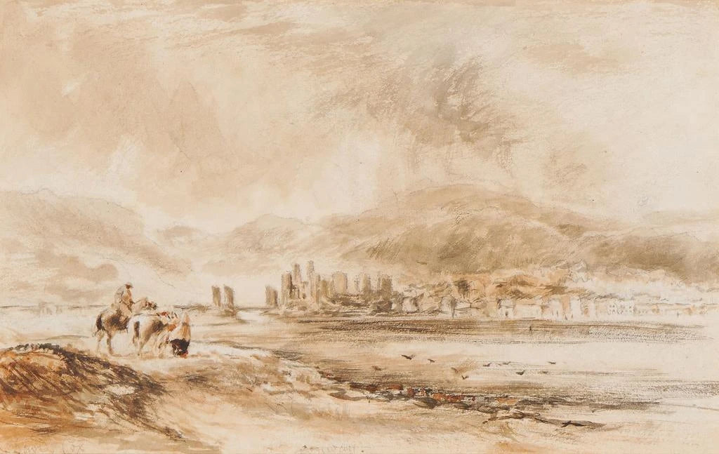 Der Conway-Kunstdruck von David Cox entführt uns in eine ländliche Landschaft, in der Natur und Mensch harmonisch koexistieren. Die sanften Farbtöne und die zarten Nuancen von Grün und Blau schaffen eine beruhigende Atmosphäre, während das Licht auf die Elemente des Gemäldes spielt und die Details der Bäume und Figuren hervorhebt. Die Aquarelltechnik, meisterhaft von Cox beherrscht, ermöglicht eine fließende Formgebung und eine Leichtigkeit im Gesamtbild, wodurch dieses Werk fast ätherisch wirkt. Die Figuren, die alltäglichen Aktivitäten nachgehen, verleihen dieser friedlichen Szene eine lebendige Note und laden den Betrachter ein, in diese ruhige Realität einzutauchen.