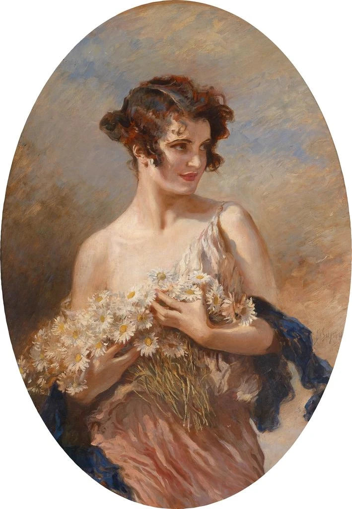 Kunstdruck | Dame mit einem Blumenstrauß Gänseblümchen - Leopold Schmutzler