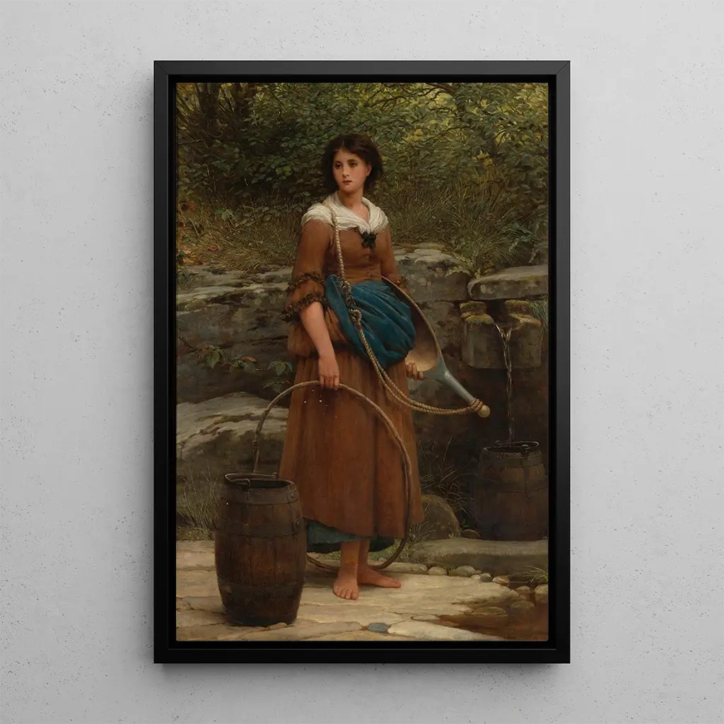 George Dunlop Leslie, aktiv im späten 19. Jahrhundert, ist ein britischer Maler, der vom präraffaelitischen Bewegung beeinflusst wurde, die eine Rückkehr zur Natur und zur Schönheit der Details forderte. Ausgebildet an der Royal Academy, gelang es ihm, Szenen des Alltagslebens mit einer einzigartigen Sensibilität einzufangen. Seine Werke, oft bevölkert von weiblichen Figuren, spiegeln eine Faszination für Schönheit und Einfachheit wider. Die Brünette junge Frau passt in diese Tradition, verbindet Romantik und Realismus, um eine poetische Atmosphäre zu schaffen. Seine Arbeit hat seine Zeit geprägt und inspiriert weiterhin Kunstliebhaber.