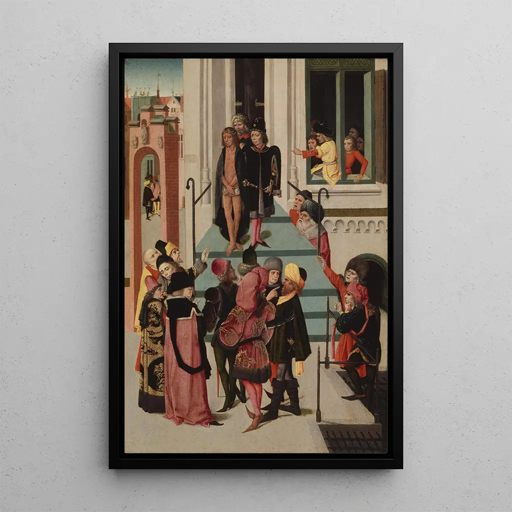 Dieses fesselnde Kunstwerk, Der Christus, der dem Volk präsentiert wird, zeigt einen bewegenden Moment aus der Passion Christi. Die dunklen Farben und die eindrucksvollen Kontraste schaffen eine dramatische Atmosphäre und verstärken die Spannung zwischen der zentralen Figur des Christus und der umgebenden Menge. Die Ölmaltechnik, typisch für die niederländische Schule, ermöglicht es, Details mit bemerkenswerter Präzision wiederzugeben, von den Gesichtsausdrücken bis zu den Falten der Kleidung. Jede Figur scheint eine Geschichte zu erzählen und lädt den Betrachter ein, in diese emotional aufgeladene und symbolträchtige Szene einzutauchen.