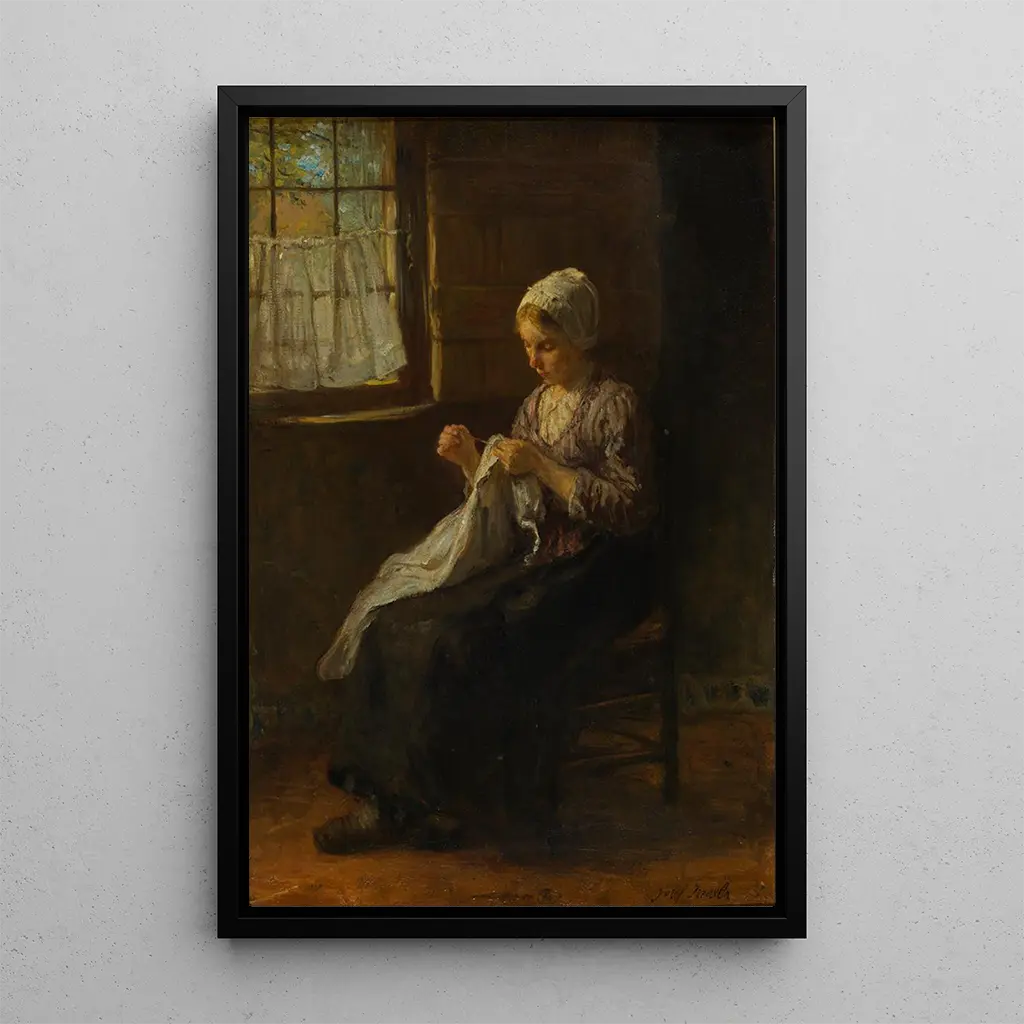 In diesem berührenden Werk fängt Jozef Israëls das Wesen eines intimen und zarten Moments ein. Die junge Schneiderin, vertieft in ihre Arbeit, ist umgeben von Stoffen in sanften, warmen Farbtönen, die eine Atmosphäre der Gelassenheit schaffen. Die subtil dargestellten Lichtspiele betonen die Details ihres konzentrierten Gesichts, während die Pastellfarben die Sanftheit des häuslichen Lebens hervorrufen. Dieses Gemälde lädt zu einer beruhigenden Betrachtung ein, bei der jeder Pinselstrich eine Geschichte von Hingabe und Leidenschaft erzählt.
