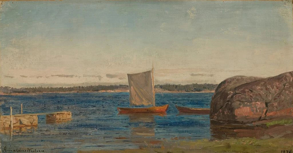 De Hvaler : eine maritime Szene voller Gelassenheit Die kunstdruck De Hvaler von Amaldus Nielsen fängt die ruhige Schönheit der norwegischen Küstenlandschaften ein. Dieses Gemälde zeigt eine Panoramaansicht der Hvaler-Inseln, wo sich Meer und Land harmonisch verbinden. Die Nuancen von Blau und Grün verschmelzen sanft und erzeugen eine friedliche, kontemplative Atmosphäre. Die Technik von Nielsen, gekennzeichnet durch fließende Pinselstriche und eine sorgfältige Detailarbeit, lässt die Meeresbrise und das Sonnenlicht auf dem Wasser spüren. Jedes Element der Komposition, von den Felsen bis zu den Segeln der Boote, trägt dazu bei, eine Einladung zur Flucht aus dem Alltag zu schaffen. Amaldus Nielsen : ein Meister der skandinavischen Landschaft Amaldus Nielsen, aktiv im 19. Jahrhundert, ist bekannt für seine maritimen Landschaften und Darstellungen der norwegischen Natur. Beeinflusst vom Romantizismus spiegelt sein Werk eine tiefe Bewunderung für die wilde Schönheit seines Heimatlandes wider. Nielsen hat die Essenz von Licht und Farben eingefangen, was ihm einen bedeutenden Platz in der Geschichte der skandinavischen Kunst einbrachte. Seine Reisen durch Norwegen bereicherten seinen Stil und ermöglichten ihm, verschiedene Techniken und Perspektiven zu erforschen. Der kunstdruck De Hvaler zeugt von seinem außergewöhnlichen Talent und seinem Engagement für die authentische Darstellung der Landschaften. Eine dekorative Anschaffung mit vielfältigen Vorzügen Der kunstdruck De Hvaler ist ein ideales Dekorationsstück, um Ihr Wohnzimmer, Büro oder Schlafzimmer zu verschönern. Seine Druckqualität garantiert eine bemerkenswerte Farbtreue und Detailgenauigkeit des Originalwerks und verleiht Ihrem Interieur eine elegante Note. Dieses Bild, mit seiner ruhigen Atmosphäre, lädt zur Entspannung und Kontemplation ein und macht jeden Blick zu einem Moment des Friedens. Durch die Integration dieses Leinwandbildes in Ihre Dekoration fügen Sie nicht nur ein Kunstwerk hinzu, sondern auch ein Fenster zur natürlichen Schönheit Norwegens, das Ihren Lebensraum bereichert.