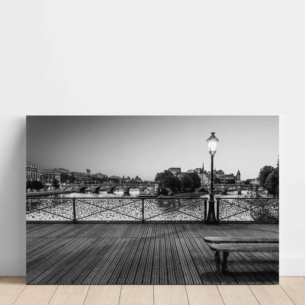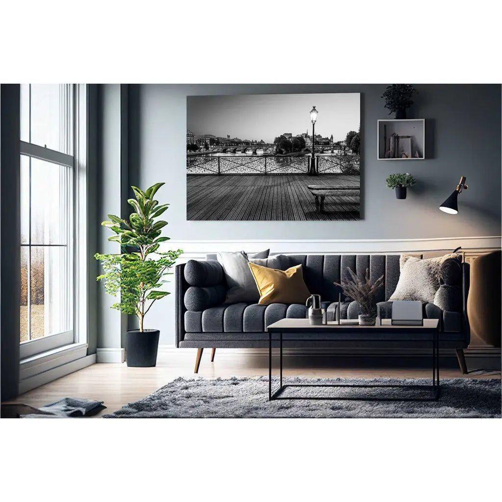 Bringen Sie einen Hauch von Pariser Eleganz in Ihr Zuhause mit diesem wunderschönen Schwarz-Weiß-Poster der Pont des Arts, eine wahre Hommage an die Schönheit und Geschichte der Stadt der Lichter. Dieser künstlerisch präzise aufgenommene Fotodruck hebt eine der berühmtesten Brücken von Paris hervor, die nicht nur für ihre anmutige Architektur, sondern auch für ihre romantische Atmosphäre bekannt ist, die Liebhaber aus aller Welt anzieht. Die Pont des Arts, die die Seine zwischen dem Louvre und dem Institut de France überspannt, ist ein Symbol der Pariser Kultur und des Erbes. Diese Brücke war lange Zeit ein Ort, an dem Paare ihre Liebe besiegelten, indem sie Schlösser an den Gittern befestigten, eine Tradition, die zu ihrem ikonischen Status beigetragen hat.