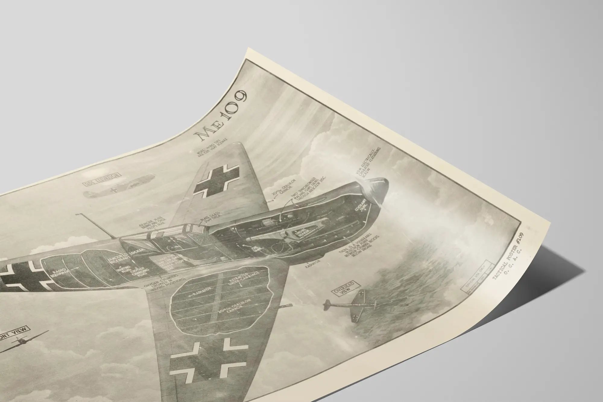 Neben seinem dekorativen Wert kann dieses Poster auch als Lehrmaterial dienen, mit klaren und präzisen Legenden, die die strategischen Funktionen der einzelnen Teile des Me 109 erklären. Eine schöne Möglichkeit, Wanddekoration und Leidenschaft für die Luftfahrt durch ein detailliertes und informatives visuelles Objekt zu verbinden. Fügen Sie dieses einzigartige Element Ihrer Sammlung von Postern oder Plakaten zum Thema Militär oder Luftfahrt hinzu und verleihen Sie Ihren Wänden Charakter.