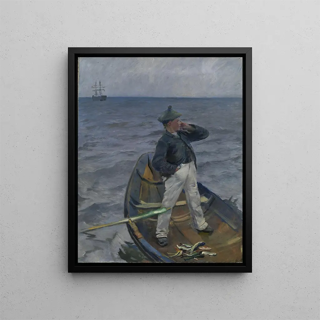 Reproduktion Der Küstenkanal - Christian Krohg – Faszinierende Einführung In der vielfältigen Welt der Kunst gelingt es manchen Werken, die Essenz eines Moments, einer Atmosphäre, einer Emotion einzufangen. "Der Küstenkanal - Christian Krohg" reiht sich in diese Linie ein und lädt den Betrachter ein, in eine maritime Landschaft einzutauchen, die von Gelassenheit und Geheimnis durchdrungen ist. Dieses Gemälde, geschaffen von einem Meister des norwegischen Realismus, versetzt uns an die Ufer eines Kanals, wo das Licht mit dem Wasser spielt und die Nuancen von Blau und Grün harmonisch verschmelzen. Durch dieses Werk gelingt es Krohg, nicht nur die Schönheit der Natur zu beschreiben, sondern auch die Zerbrechlichkeit der menschlichen Existenz angesichts der Weite der natürlichen Welt zu vermitteln. Stil und Einzigartigkeit des Werks Der Stil von Christian Krohg zeichnet sich durch seine Fähigkeit aus, technische Präzision mit emotionaler Sensibilität zu verbinden. In "Der Küstenkanal" scheint jeder Pinselstrich ein Spiegelbild einer sorgfältigen Beobachtung zu sein, bei der die Sonnenstrahlen die Wasseroberfläche zart streicheln. Die vom Künstler gewählten Farbtöne rufen eine Palette von Empfindungen hervor, die von der Sanftheit der Reflexionen bis zur Intensität der Schatten reichen. Dieses Werk beschränkt sich nicht auf eine einfache Darstellung einer Landschaft; es wird zu einem wahren visuellen Gedicht, bei dem jedes Element, vom Himmel bis zu den Felsen, dazu beiträgt, eine Atmosphäre der Ruhe zu schaffen. Die sorgfältig ausgearbeitete Komposition lenkt den Blick des Betrachters durch den Kanal und lädt zu einer längeren Betrachtung sowie zu einer Eintauchen in diese maritime Szene ein. Der Künstler und sein Einfluss Christian Krohg, eine bedeutende Figur der norwegischen Kunst des 19. Jahrhunderts, prägte seine Epoche durch sein Engagement für den Realismus und seine Erforschung sozialer Themen. Sein Werk spiegelt eine Zeit wider, in der die Kunst die Wahrheit des täglichen Lebens darstellen sollte, während sie gleichzeitig die Schönheit der natürlichen Welt feierte. Krohg wurde von europäischen Kunstbewegungen beeinflusst, entwickelte jedoch einen eigenen Stil, der in seiner skandinavischen Kultur verwurzelt ist. Seine Fähigkeit, flüchtige Momente einzufangen und auf Leinwand zu verewigen, inspirierte zahlreiche zeitgenössische Künstler und machte ihn zu einer unverzichtbaren Figur in der Kunstgeschichte. Durch "Der Küstenkanal"
