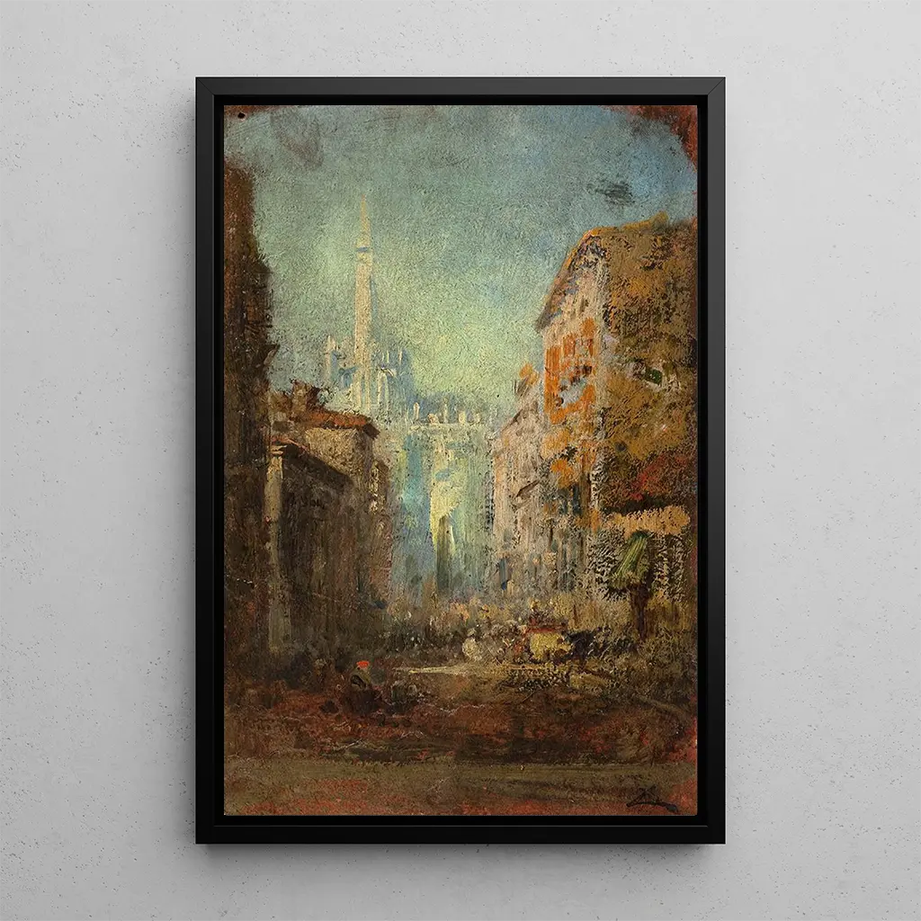 Das Gemälde "Le Dôme de Milan" von Félix Ziem fängt die Größe dieser ikonischen Kathedrale ein, getaucht in ein goldenes Licht. Die detaillierten Spitzen und Skulpturen ragen zum Himmel empor, während die Nuancen von Blau und Rosa einen bezaubernden Sonnenuntergang hervorrufen. Die Technik von Ziem, die Öl und zarte Pinselstriche kombiniert, schafft eine Atmosphäre, die sowohl ruhig als auch lebendig ist. Die schwebenden Wolken verleihen diesem Werk eine fast spirituelle Dimension und laden den Betrachter ein, in die zeitlose Schönheit dieses Denkmals einzutauchen.