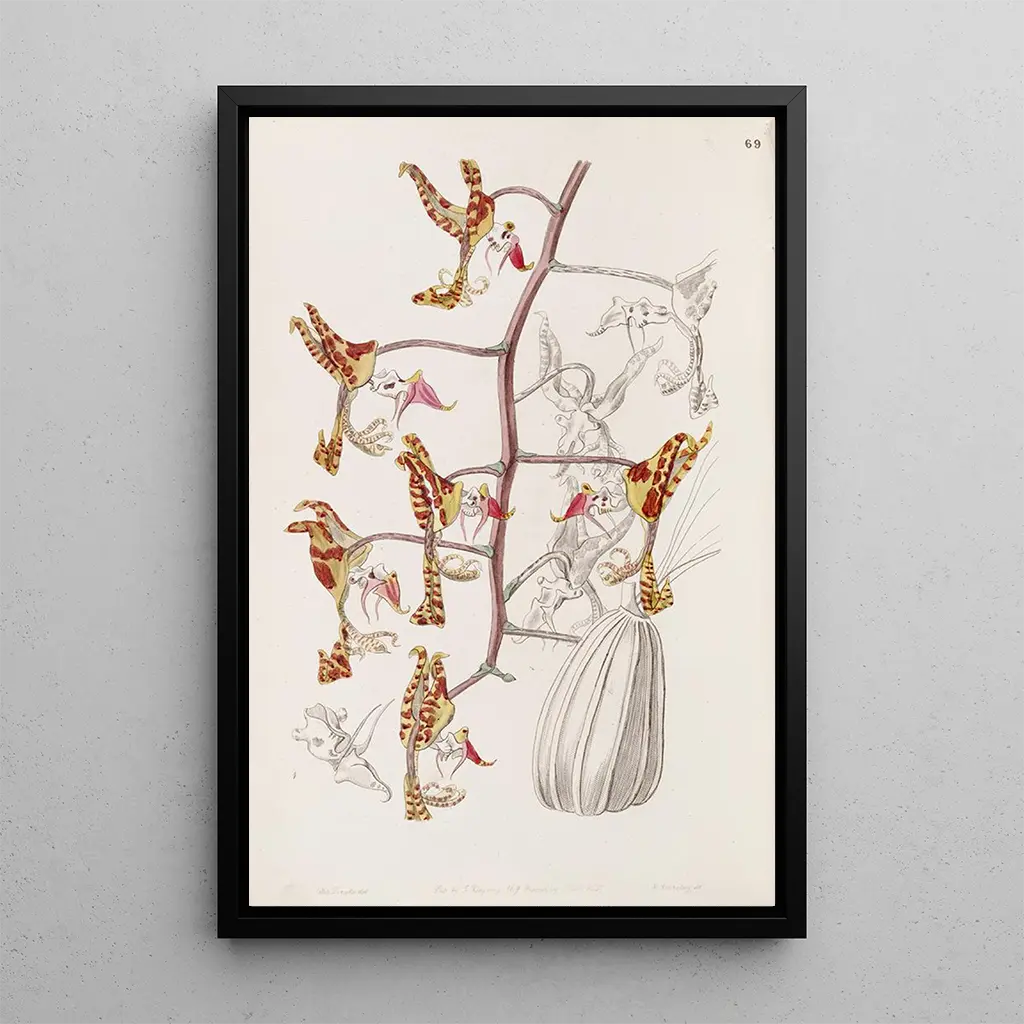 Die gongora tricolore tachetée zeichnet sich durch ihre exotischen Formen und ihre gefleckten Muster aus, die den Blick auf sich ziehen. Dieses werk, mit bemerkenswerter Präzision gefertigt, hebt die einzigartige Schönheit dieser Orchidee hervor. Die Nuancen von Gelb, Rot und Grün verschmelzen harmonisch und schaffen eine lebendige und dynamische Atmosphäre. Die reproduction dieser seltenen blume von Sydenham Edwards lädt dazu ein, die Wunder der Botanik zu erkunden und gleichzeitig die Vielfalt der Formen und Farben zu feiern, die die Natur zu bieten hat.