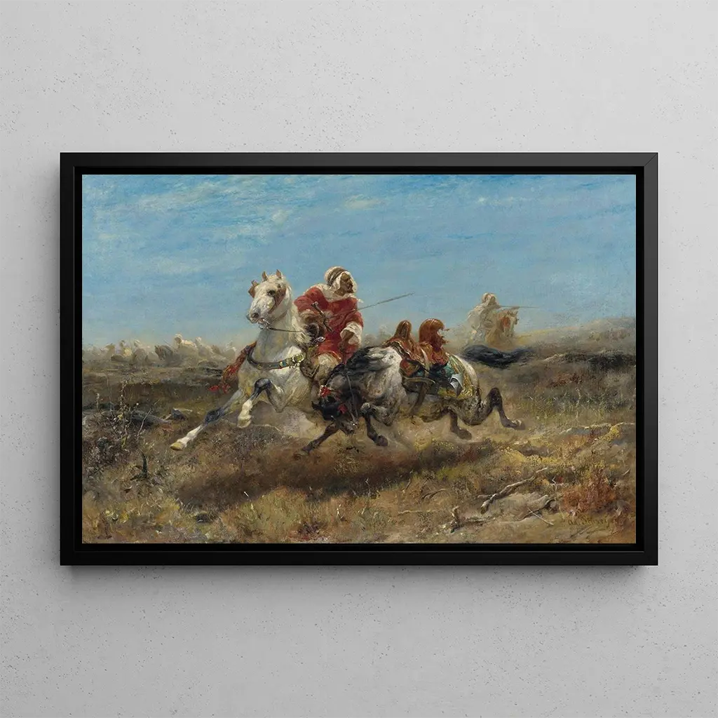 In "La Chasse" taucht Adolf Schreyer ein in eine lebendige Szene, in der die wilde Natur in ihrer ganzen Pracht enthüllt wird. Die Tiere, eingefangen in einem Moment der Spannung, sind mit bemerkenswerter Präzision dargestellt, während die umliegende Landschaft, reich an Details, eine Atmosphäre von sowohl Dynamik als auch Majestät vermittelt. Die erdigen Farben und die Grüntöne schaffen einen auffälligen Kontrast und verstärken die Intensität der Szene. Dieses Werk lädt zu einer vollständigen Eintauchen in die Welt der Fauna ein, in der jeder Blick eine neue Facette des wilden Lebens offenbart.