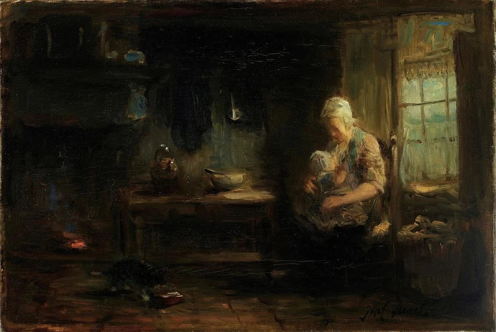 Jozef Israëls, geboren 1824 in den Niederlanden, ist ein bedeutender Vertreter der realistischen Bewegung. Beeinflusst von den Meistern der holländischen Malerei, entwickelte er einen Stil, der Realismus und Emotion verbindet. Seine Werke, oft fokussiert auf Alltagsthemen und menschliche Beziehungen, zeugen von einer tiefen Empathie für seine Motive. Die junge Mutter reiht sich in diese Tradition ein, hebt die Familienwerte und die Schönheit einfacher Momente hervor. Israëls war auch ein Vorreiter in der Verwendung von Licht, um Gefühle zu vermitteln, was dieses Gemälde zu einem emblematischen Stück seines Schaffens macht.