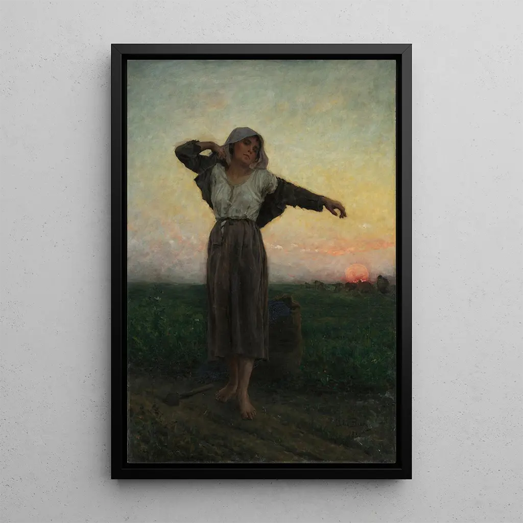 In "La glaneuse fatiguée" fängt Jules Breton die Essenz der harten Arbeit der Bäuerinnen ein. Dieses Gemälde zeigt eine Szene des Alltags, in der eine Glaneuse, gebeugt unter der Last ihrer Arbeit, sowohl resigniert als auch voller Würde erscheint. Die warmen Farben, dominiert von Erdtönen und Grün, schaffen eine Atmosphäre von Gelassenheit und Melancholie. Das sanfte Licht, das das Gesicht der Glaneuse erleuchtet, verleiht diesem Werk eine fast spirituelle Dimension und lädt den Betrachter ein, die Anstrengung und Entschlossenheit dieser oft vergessenen Frauen zu spüren.