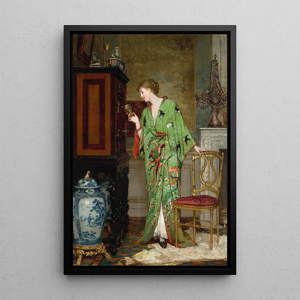 Die Sammlung im grünen Kimono: eine Hommage an die weibliche Schönheit „Die Sammlung im grünen Kimono“ von Jan Verhas ist ein fesselndes Werk, das die Anmut und Eleganz der weiblichen Schönheit feiert. Die Komposition hebt eine Frau hervor, die einen reich verzierten Kimono trägt, umgeben von Kunstobjekten, die ihren feinen Geschmack widerspiegeln. Die leuchtenden Farben und die detaillierten Feinheiten schaffen eine lebendige Atmosphäre, in der jedes Element eine Geschichte zu erzählen scheint. Die Technik von Verhas, die Realismus und Feinheit verbindet, ermöglicht es, die Textur der Stoffe und die Zartheit der Accessoires zu spüren und den Betrachter in eine Welt voller Schönheit und Raffinesse einzutauchen. Jan Verhas: ein Künstler an der Schnittstelle der Einflüsse Jan Verhas, geboren 1834, ist ein belgischer Maler, dessen Werk die Einflüsse des Realismus und des Orientalismus des 19. Jahrhunderts widerspiegelt. Seine Karriere war geprägt von einer Faszination für die asiatische Kultur, was sich in Werken wie „Die Sammlung im grünen Kimono“ zeigt. Verhas konnte die Essenz seiner Motive mit einer einzigartigen Sensibilität einfangen und hob sich in der künstlerischen Landschaft seiner Zeit hervor. Seine innovative Herangehensweise und seine Liebe zum Detail machten ihn zu einem respektierten Künstler, dessen Werke weiterhin inspirieren und begeistern. Eine dekorative Anschaffung mit vielfältigen Vorzügen Der kunstdruck von „Die Sammlung im grünen Kimono“ ist eine ideale Wahl, um Ihr Zuhause zu bereichern, sei es im Wohnzimmer, Schlafzimmer oder Büro. Seine Druckqualität und die Treue zum Originalwerk garantieren ein immersives visuelles Erlebnis. Dieses Bild, mit seiner raffinierten Ästhetik, bringt einen Hauch von Exotik und Raffinesse in Ihre Dekoration. Durch die Integration dieses Leinwandbildes in Ihren Raum schaffen Sie eine warme und einladende Atmosphäre und feiern gleichzeitig Kunst und Schönheit in all ihren Formen.