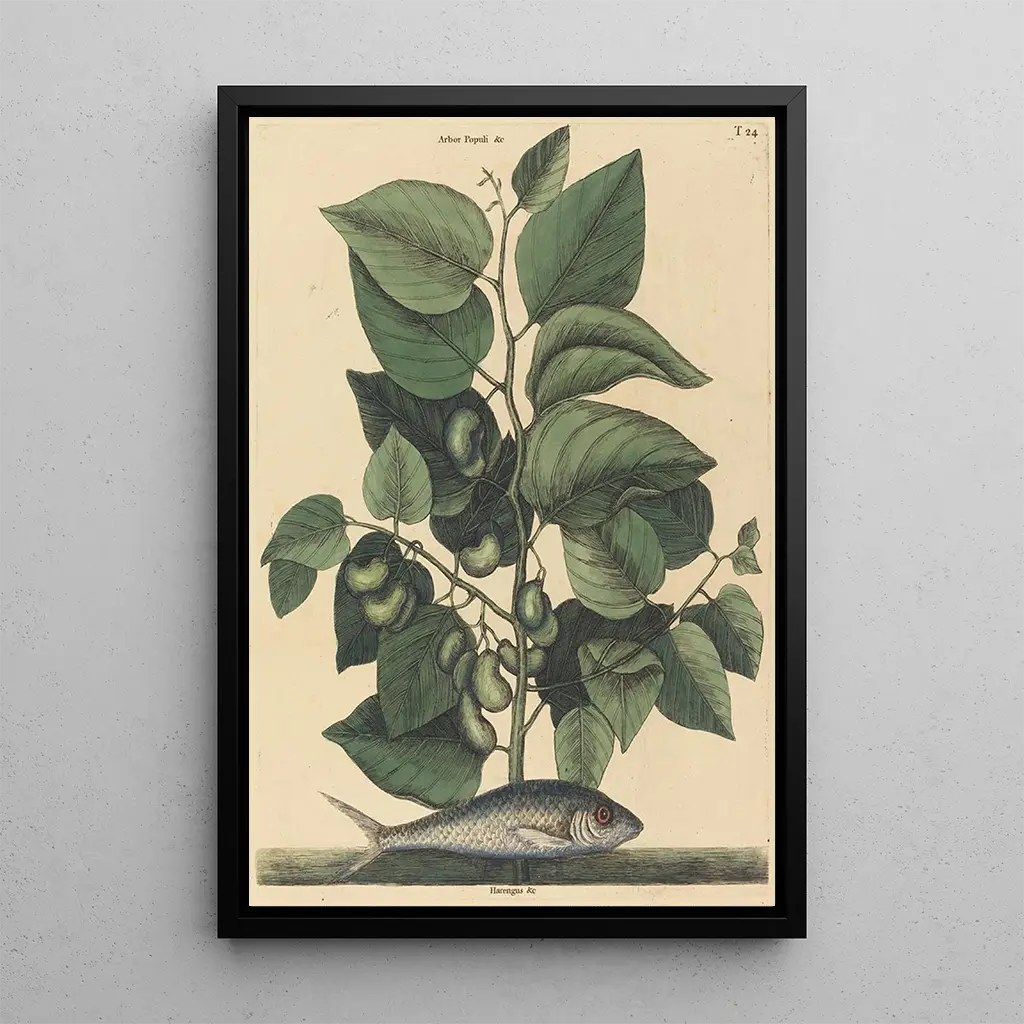 Die reproduction von La Sardine Argentina carolina von Mark Catesby taucht ein in die faszinierende Welt des Meereslebens. Dieses Werk, mit bemerkenswerter Präzision gefertigt, hebt die zarten Details der Sardine hervor, ihre schimmernden Schuppen und die Nuancen von Blau und Silber. Die Aquarelltechnik, die Catesby verwendet, verleiht dem Bild Leichtigkeit und Transparenz und ruft die Flüssigkeit des Wassers hervor. Die allgemeine Atmosphäre des Gemäldes ist sowohl beruhigend als auch lebendig, lädt den Betrachter ein, die Tiefen des Meeres zu erkunden und die Schönheit der Natur zu schätzen.