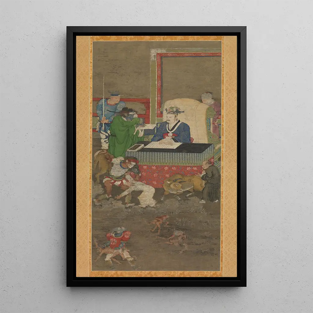 Les zehn Könige der Hölle 4 : ein Blick auf das Urteil der Seelen Die reproduction von "Les dix rois des enfers 4" lädt dazu ein, in eine Welt einzutauchen, in der das Schicksal der Seelen besiegelt ist. Die dunklen Farben, hervorgehoben durch goldene Akzente, schaffen eine dramatische und fesselnde Atmosphäre. Jeder König, mit seinem strengen Ausdruck, verkörpert die verschiedenen Facetten des Urteils. Die Technik von Jin Chushi, die Präzision und Flüssigkeit vereint, erweckt diese komplexe Szene zum Leben, bei der jedes Detail zählt. Dieses Gemälde, zugleich geheimnisvoll und ausdrucksstark, regt zum Nachdenken über die Konsequenzen unseres Handelns an. Jin Chushi : ein Pfeiler der chinesischen narrativen Kunst Jin Chushi, renommierter Künstler der Ming-Dynastie, ist bekannt für seine Werke, die Kunst und Philosophie verbinden. Seine Arbeiten sind inspiriert von mythologischen Erzählungen und Volksglauben, was ihm ermöglicht, Gemälde mit bedeutungsvoller Aussagekraft zu schaffen. Durch "Les dix rois des enfers 4" erforscht er die Themen Karma und Vergeltung und bietet eine subtile Gesellschaftskritik. Sein unverwechselbarer Stil, geprägt von dynamischen Kompositionen und lebendigen Farben, macht ihn zu einer bedeutenden Figur der chinesischen Kunst, deren Einfluss bis heute anhält. Eine dekorative Anschaffung mit vielfältigen Vorteilen Die Wahl einer reproduction von "Les dix rois des enfers 4" ist eine originelle Möglichkeit, Ihr Zuhause zu verschönern. Ob im Arbeitsbereich, im Wohnzimmer oder im Schlafzimmer, diese Leinwand verleiht Ihrer Dekoration eine künstlerische und philosophische Dimension. Die Qualität der reproduction garantiert eine bemerkenswerte Treue zu den Originalwerken, sodass jede Nuance und jedes Detail geschätzt werden kann. Mit ihrer starken visuellen Anziehungskraft wird dieses Gemälde zu einem Gesprächsthema und bereichert gleichzeitig die Atmosphäre Ihres Wohnraums.