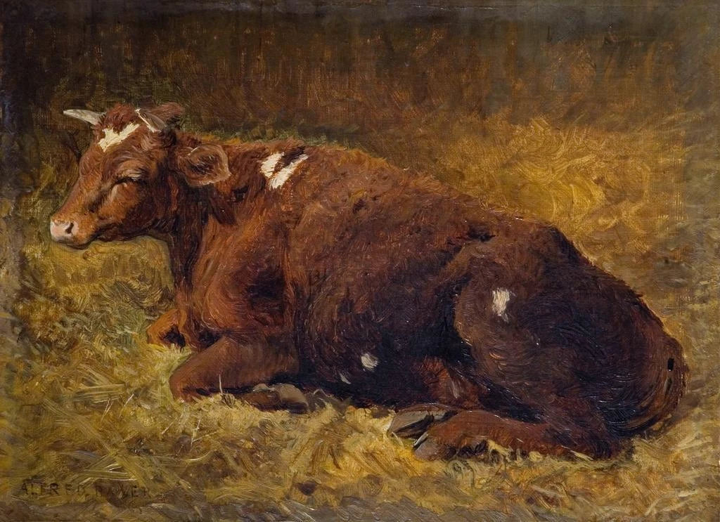 Eine liegende Kuh auf dem Boden - Alfred Baker