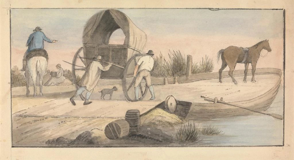 Das Werk "Einschiffung auf der Fähre" von Edward Francis Burney fängt auf feine Weise einen Moment des Übergangs und der Erwartung ein. Die Komposition ist reich an Details, bei denen jede Figur eine Geschichte zu erzählen scheint. Die sanften, pastellfarbenen Töne erzeugen eine ruhige Atmosphäre, während die Aquarelltechnik der Szene Leichtigkeit verleiht. Die Reflexionen auf dem Wasser fügen eine dynamische Dimension hinzu und laden den Betrachter ein, die Bewegung der Fähre, die bereit ist, in See zu stechen, zu spüren. Dieses Gemälde, sowohl narrativ als auch kontemplativ, versetzt den Betrachter in eine Epoche, in der Reisen gleichbedeutend mit Abenteuer waren.