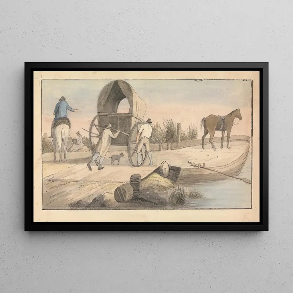 Edward Francis Burney, aktiv zu Beginn des 19. Jahrhunderts, ist bekannt für seine Meisterschaft in der Aquarelltechnik und sein Talent, Szenen des täglichen Lebens darzustellen. Beeinflusst von der romantischen Bewegung, konnte er die Schönheit der Landschaften und flüchtiger Momente einfangen. Burney war auch ein produktiver Illustrator, der mit Schriftstellern seiner Zeit zusammenarbeitete. Sein Stil zeichnet sich durch eine besondere Liebe zum Detail und eine Sensibilität für das Licht aus, was ihm geholfen hat, sich in der Welt der britischen Kunst einen Namen zu machen. "Einschiffung auf der Fähre" ist ein emblematisches Beispiel für seine künstlerische Herangehensweise, die Realismus und Poesie vereint.